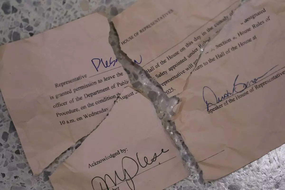 Democratic Texas state Rep. Plesa's ripped up 'permission slip' is seen outside the House Chamber after she and other democrats joined fellow Rep. Nicole Collier who refuses to leave due to a required law enforcement escort, Tuesday, Aug. 19, 2025, in Austin, Texas. (AP Photo/Eric Gay)