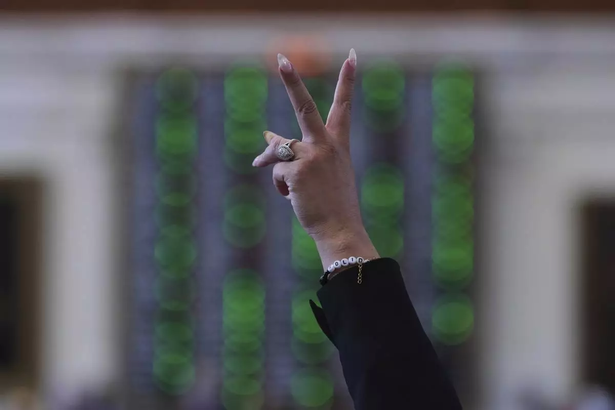 Lynn Tozser, top, shows her support for the returning Texas democrats at the Texas Capitol in Austin, Texas, Monday, Aug. 18, 2025. (AP Photo/Stephen Spillman)