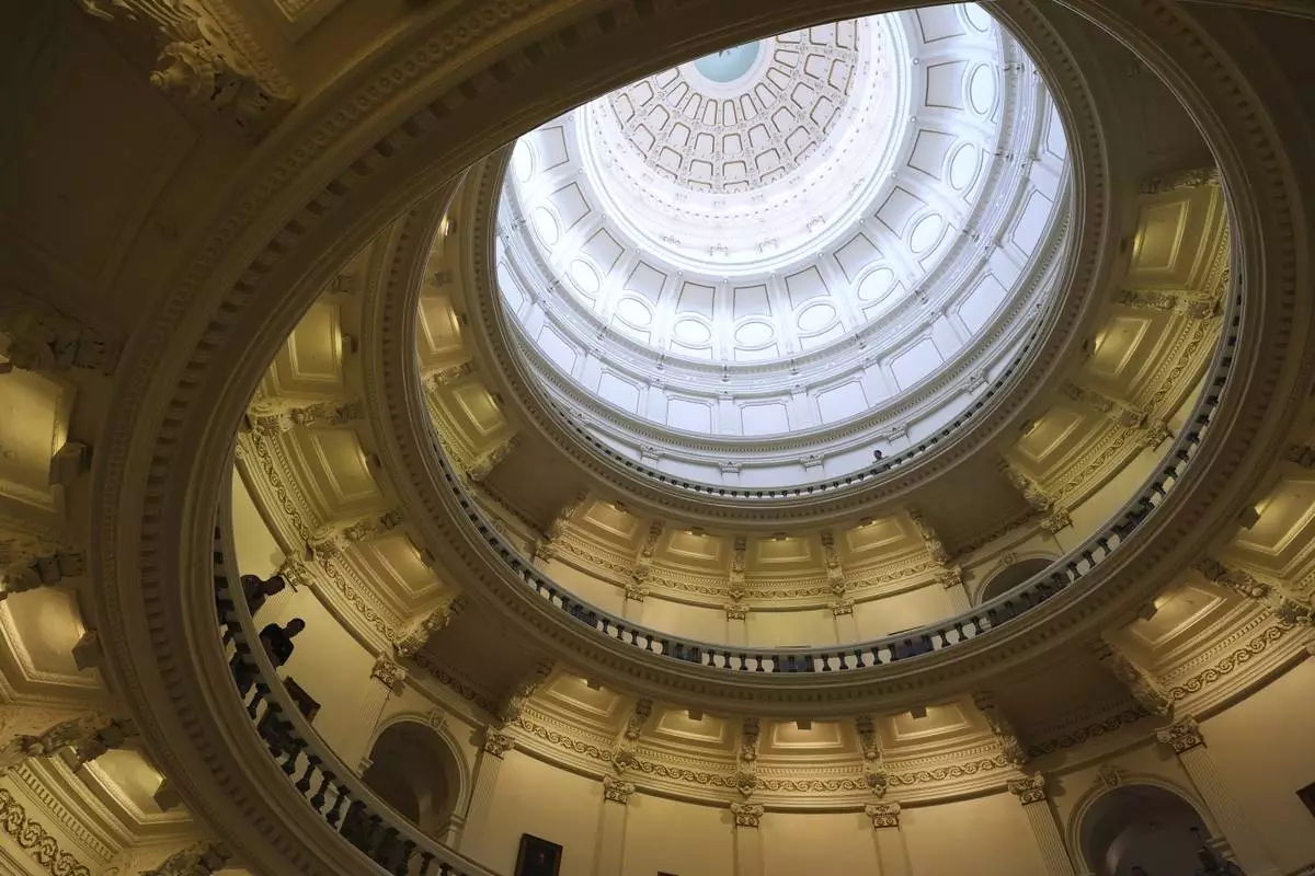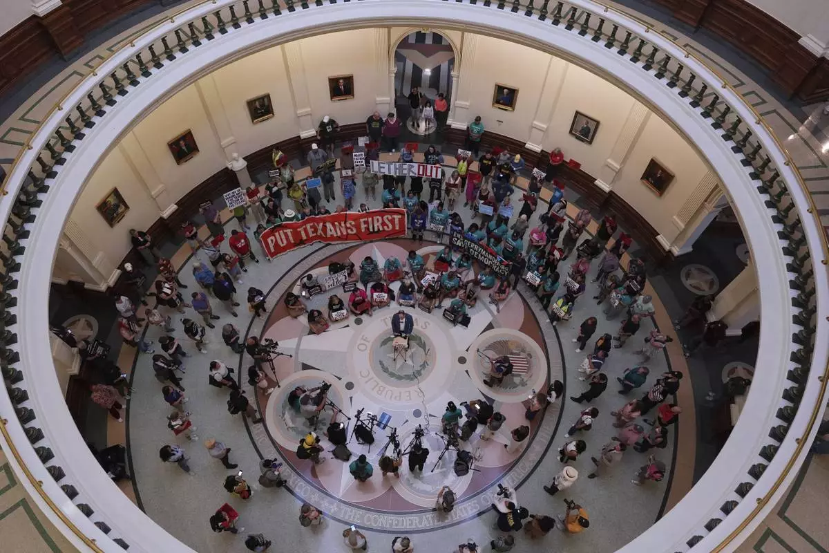 Protesters gather in the rotunda outside the House Chamber at the Texas Capitol as lawmakers debate a redrawn U.S. congressional map in Texas during a special, Wednesday, Aug. 20, 2025, in Austin, Texas. (AP Photo/Eric Gay)