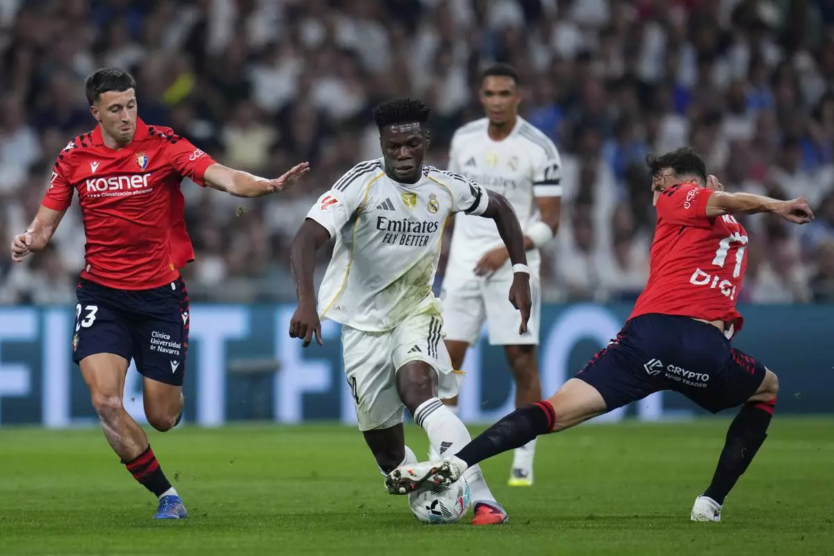 Real Madrid's Aurelien Tchouameni in action between Osasuna's Abel Bretones, left, and Ante Budimir during the La Liga soccer match between Real Madrid and Osasuna in Madrid, Spain, Tuesday, Aug. 19, 2025. (AP Photo/Manu Fernandez)