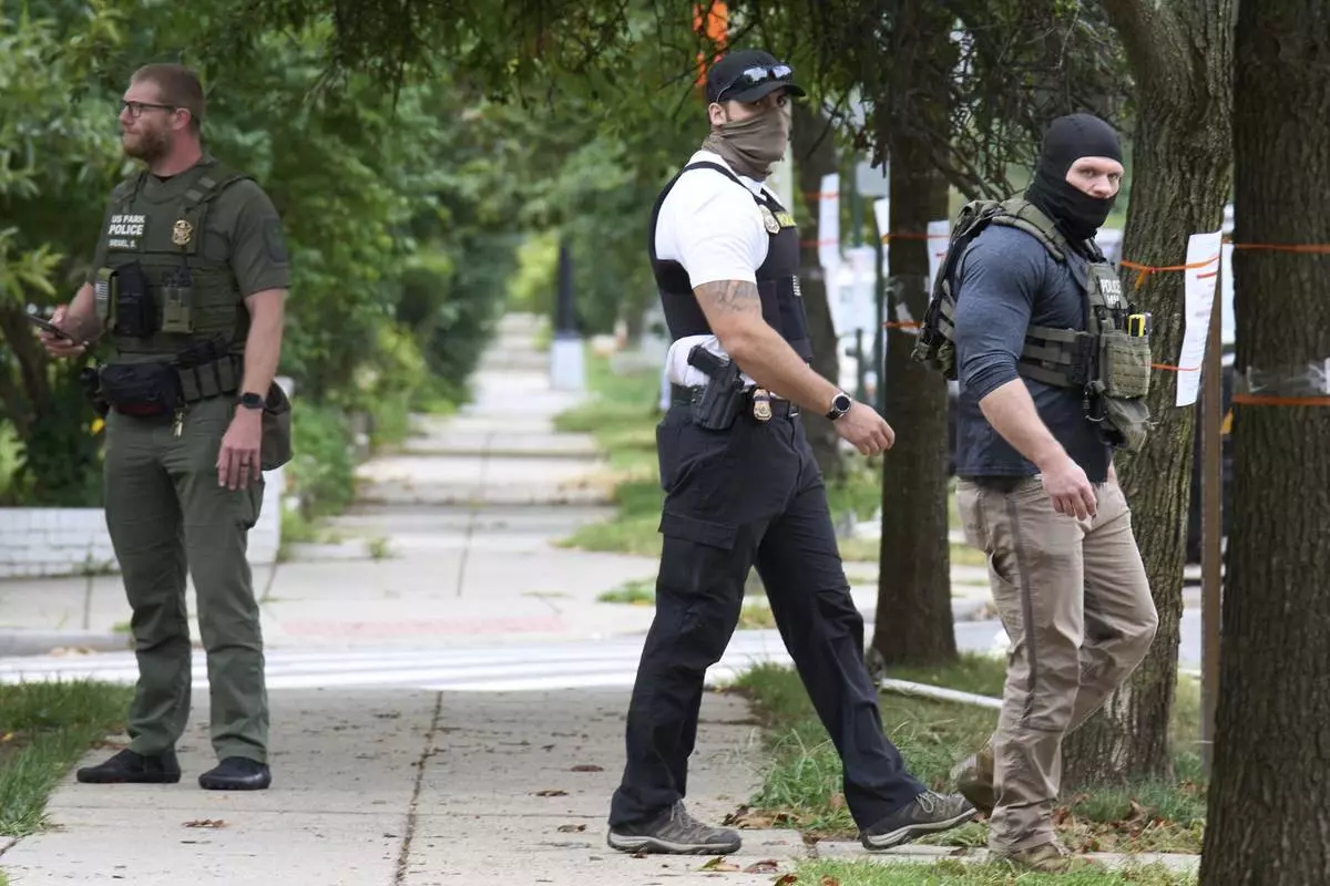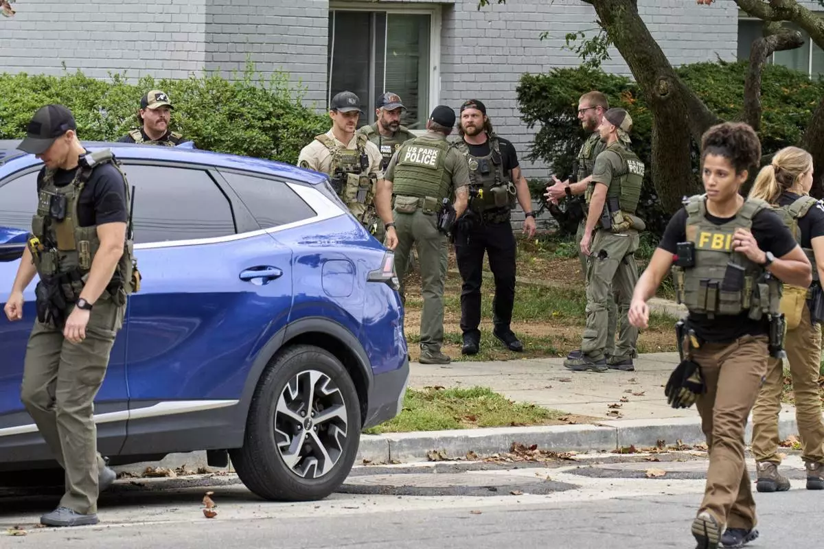 Officers from several federal agencies including FBI, Federal Marshalls, HSI, and Park Police, leave an apartment complex after arresting a man from within the apartments, Tuesday, Aug. 19, 2025, in the Petworth neighborhood of northwest Washington. (AP Photo/Jacquelyn Martin)