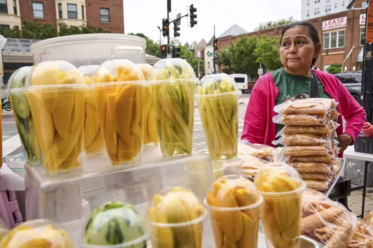 Gloria Gomez, 58, of Washington, tends her fruit stand, Tuesday, Aug. 19, 2025, as she waits for customers in the Columbia Heights neighborhood of northwest Washington. "Business is worse now than it was during the pandemic," says Gomez, "over the last three weeks it's been less and less." (AP Photo/Jacquelyn Martin)