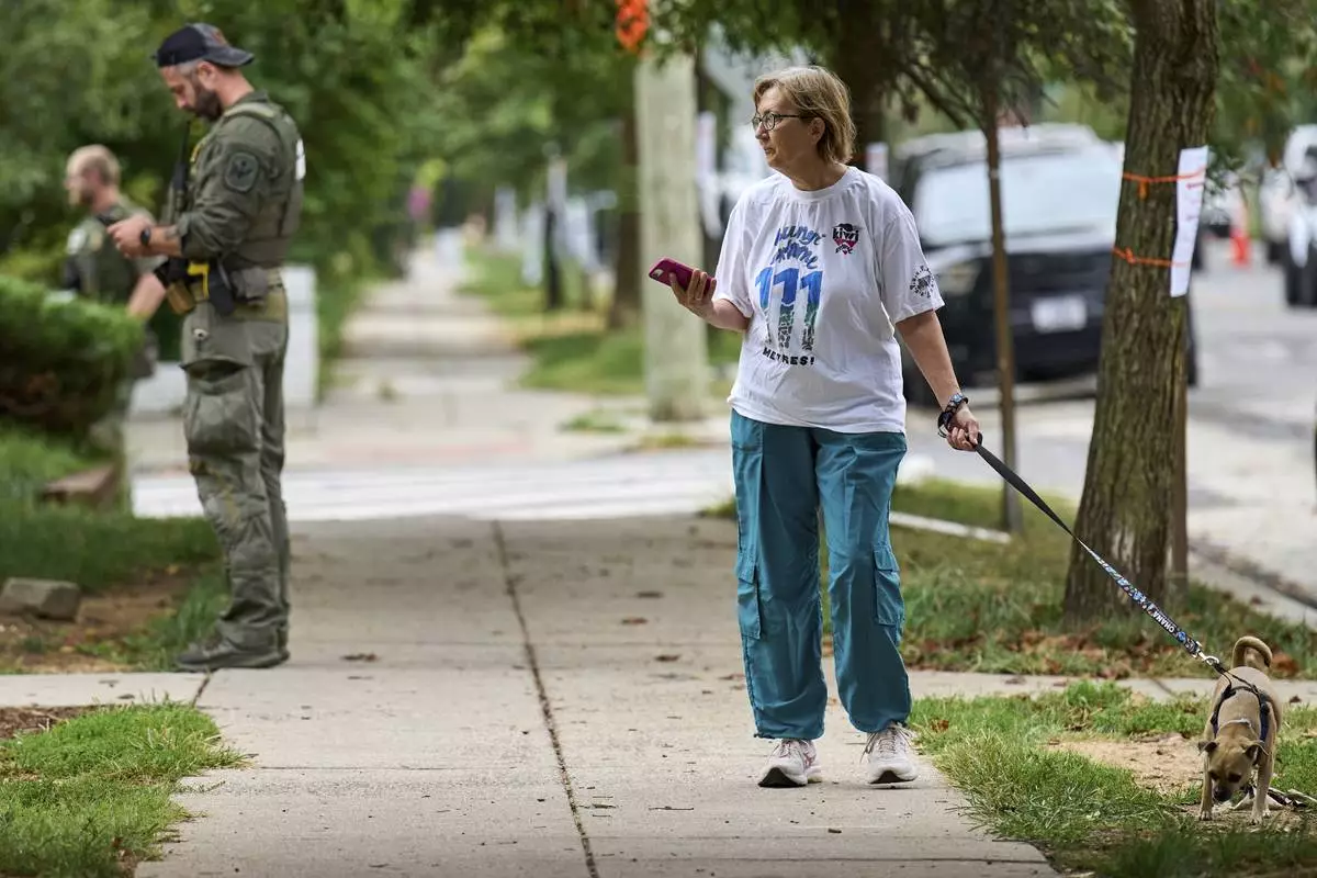 A woman walking her dog watches as officers from several federal agencies including FBI, Federal Marshalls, HSI, and Park Police, arrest a man at an apartment complex, Tuesday, Aug. 19, 2025, in the Petworth neighborhood of northwest Washington. (AP Photo/Jacquelyn Martin)
