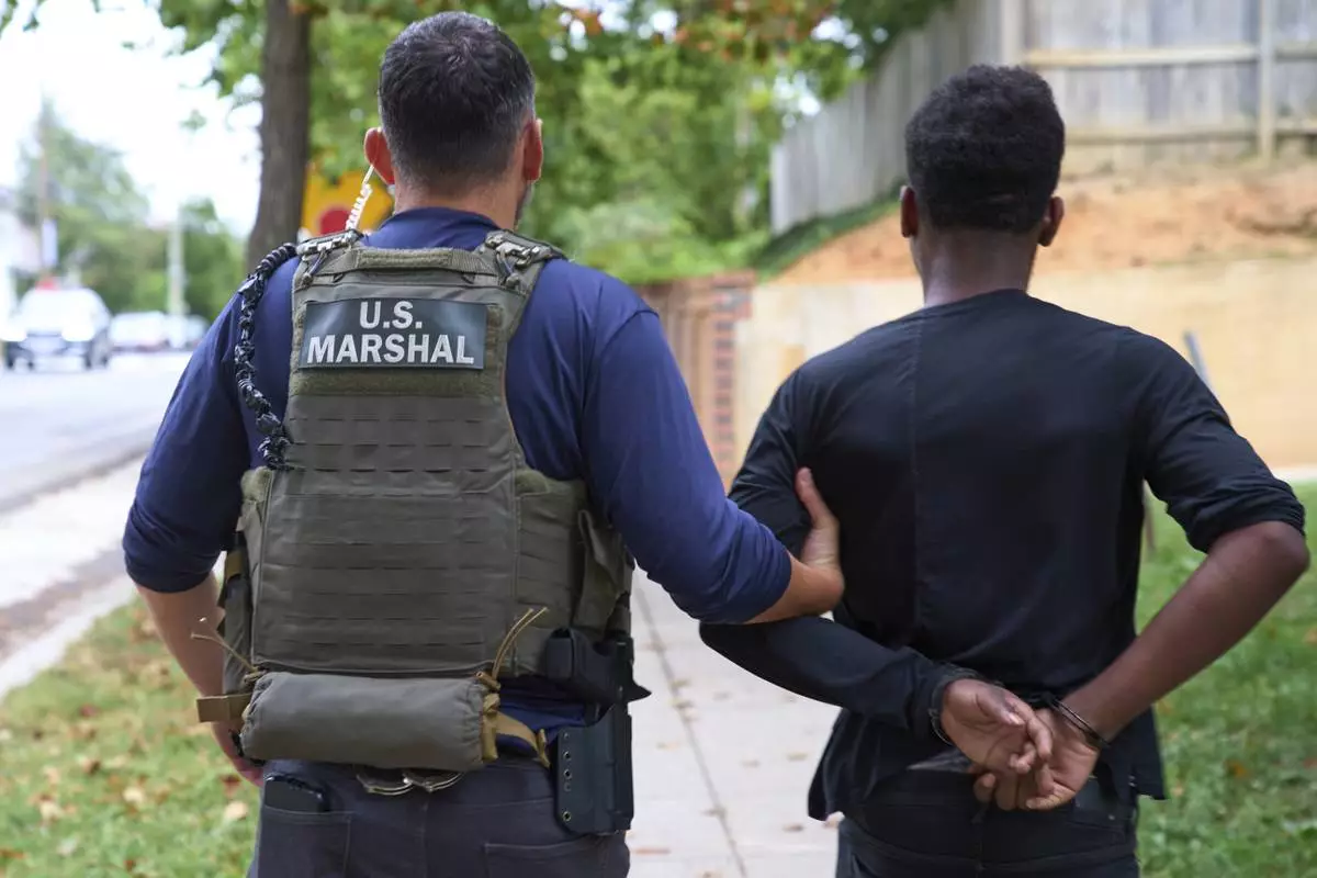 Officers from several federal agencies including U.S. Marshals, FBI, and Park Police, leave an apartment complex after arresting a man from within the apartment complex, Tuesday, August 19, 2025, in the Petworth neighborhood of northwest Washington. (AP Photo/Jacquelyn Martin)