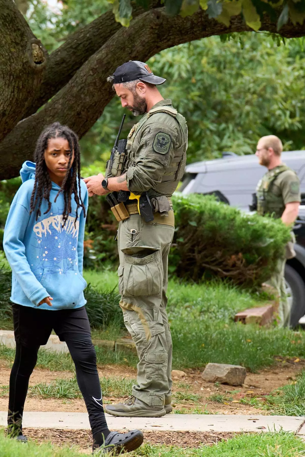 A young person walks out of their apartment building next to armed Park Police as officers from several federal agencies including Federal Marshalls, Park Police, and FBI, arrest a man from within an apartment complex, Tuesday, August 19, 2025, in the Petworth neighborhood of northwest Washington. (AP Photo/Jacquelyn Martin)