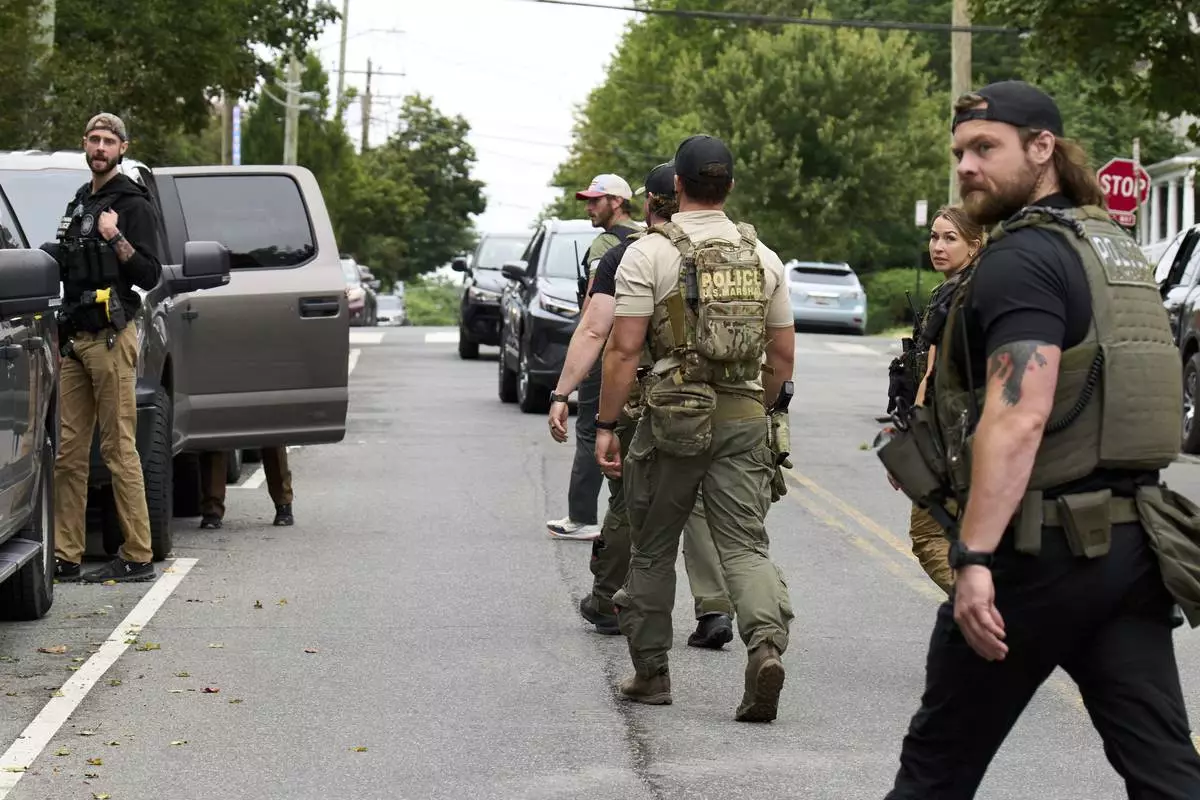 Armed officers from several federal agencies including U.S. Marshals, FBI, HSI, and Park Police, leave an apartment complex after arresting a man from within the apartment complex, Tuesday, August 19, 2025, in the Petworth neighborhood of northwest Washington. (AP Photo/Jacquelyn Martin)