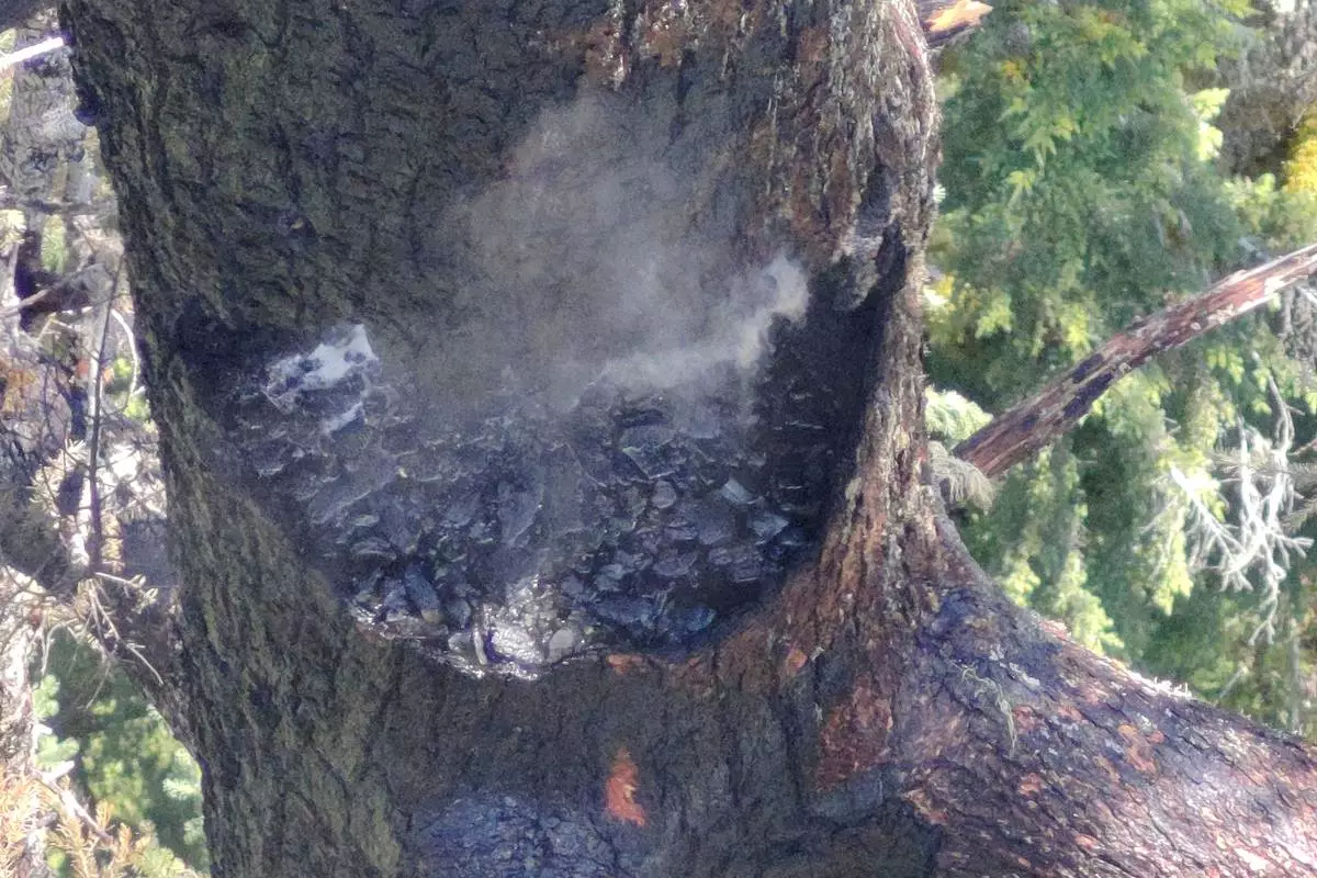 Figuring out how to approach the tree from the side to douse the cavity with water has been a challenge, Harper said. Various options have been discussed, including building scaffolding or climbing adjacent trees for better positioning, or letting it smolder and monitoring to see if it reignites.