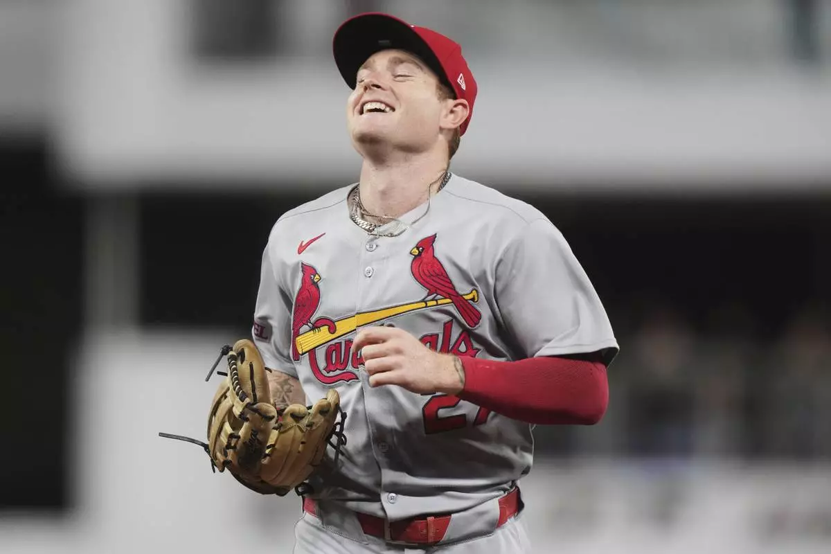 St. Louis Cardinals center fielder Nathan Church smiles as he runs off the field after catching a fly ball at the wall hit by Miami Marlins' Heriberto Hernandez during the fourth inning of a baseball game, Tuesday, Aug. 19, 2025, in Miami. (AP Photo/Lynne Sladky)