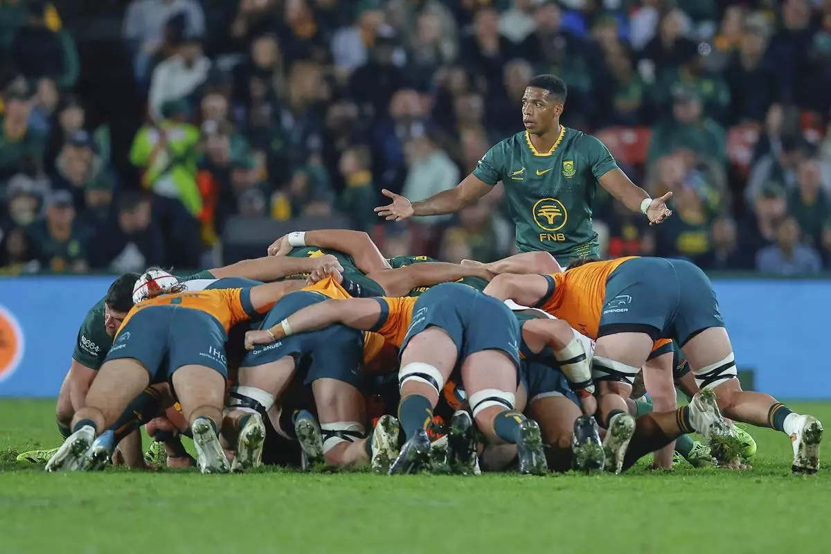 South Africa's Grant Williams, back, watches players compete for the scrum during a rugby championship test match between South Africa and Australia, at Ellis Park stadium in Johannesburg, South Africa, Saturday, Aug. 16, 2025. (AP Photo/Frans Lombard)