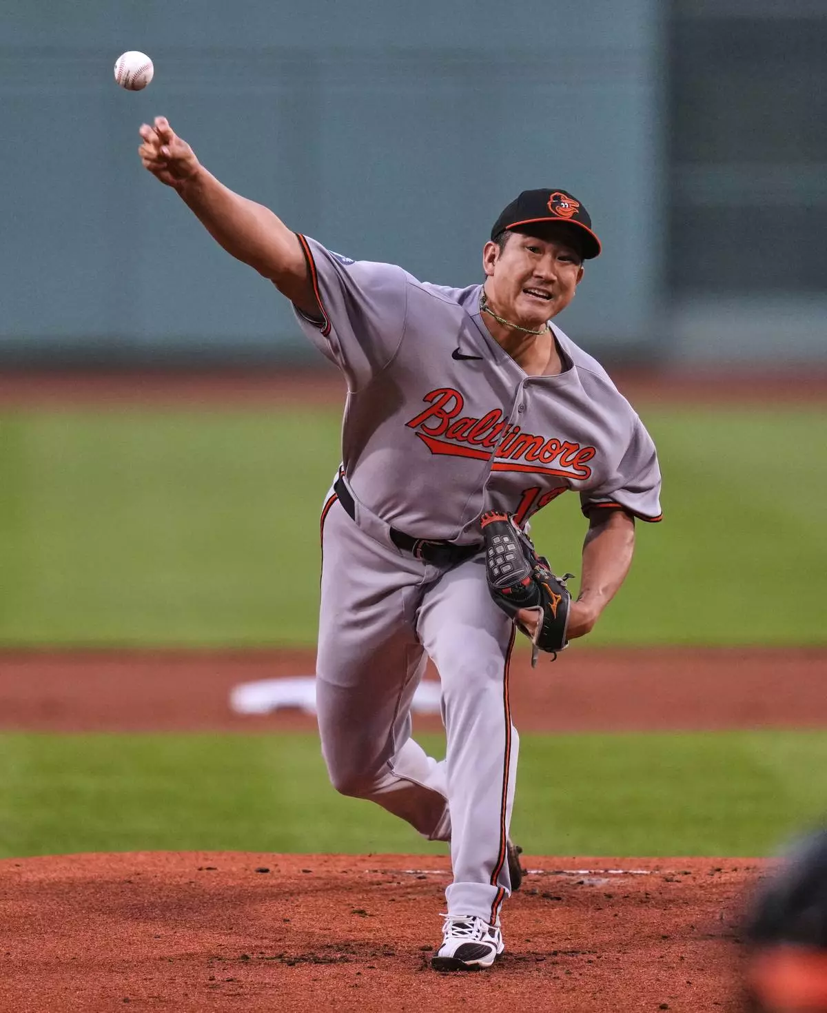 Baltimore Orioles pitcher Tomoyuki Sugano delivers in the first inning of a baseball game against the Boston Red Sox at Fenway Park, Tuesday, Aug. 19, 2025, in Boston. (AP Photo/Charles Krupa)