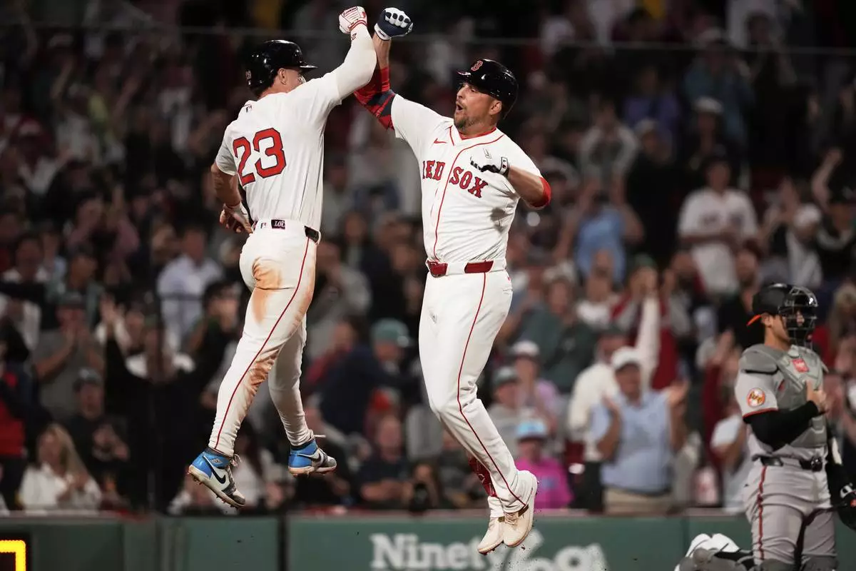 Boston Red Sox designated hitter Nathaniel Lowe, right, is congratulated by Romy Gonzalez (23) after his game-tying, two-run home run in the bottom of the ninth inning of a baseball game against the Baltimore Orioles at Fenway Park, Tuesday, Aug. 19, 2025, in Boston. (AP Photo/Charles Krupa)