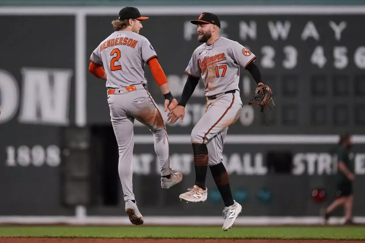 Baltimore Orioles shortstop Gunnar Henderson (2) celebrates with Baltimore Orioles outfielder Colton Cowser after defeating the Boston Red Sox after a baseball game at Fenway Park, Tuesday, Aug. 19, 2025, in Boston. (AP Photo/Charles Krupa)