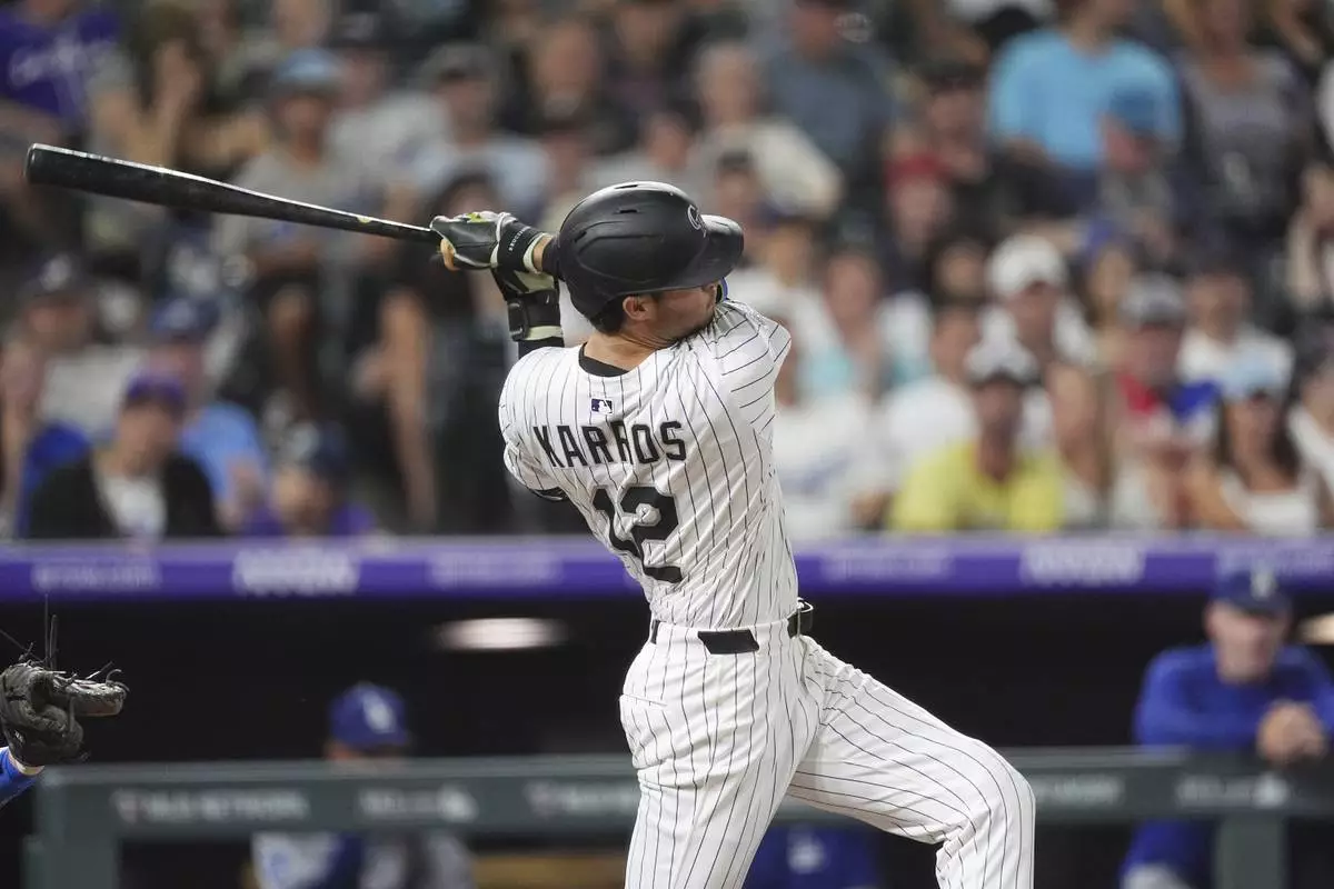 Colorado Rockies' Kyle Karros follows the flight of his two-run home run off Los Angeles Dodgers starting pitcher Emmet Sheehan in the sixth inning of a baseball game Tuesday, Aug. 19, 2025, in Denver. (AP Photo/David Zalubowski)