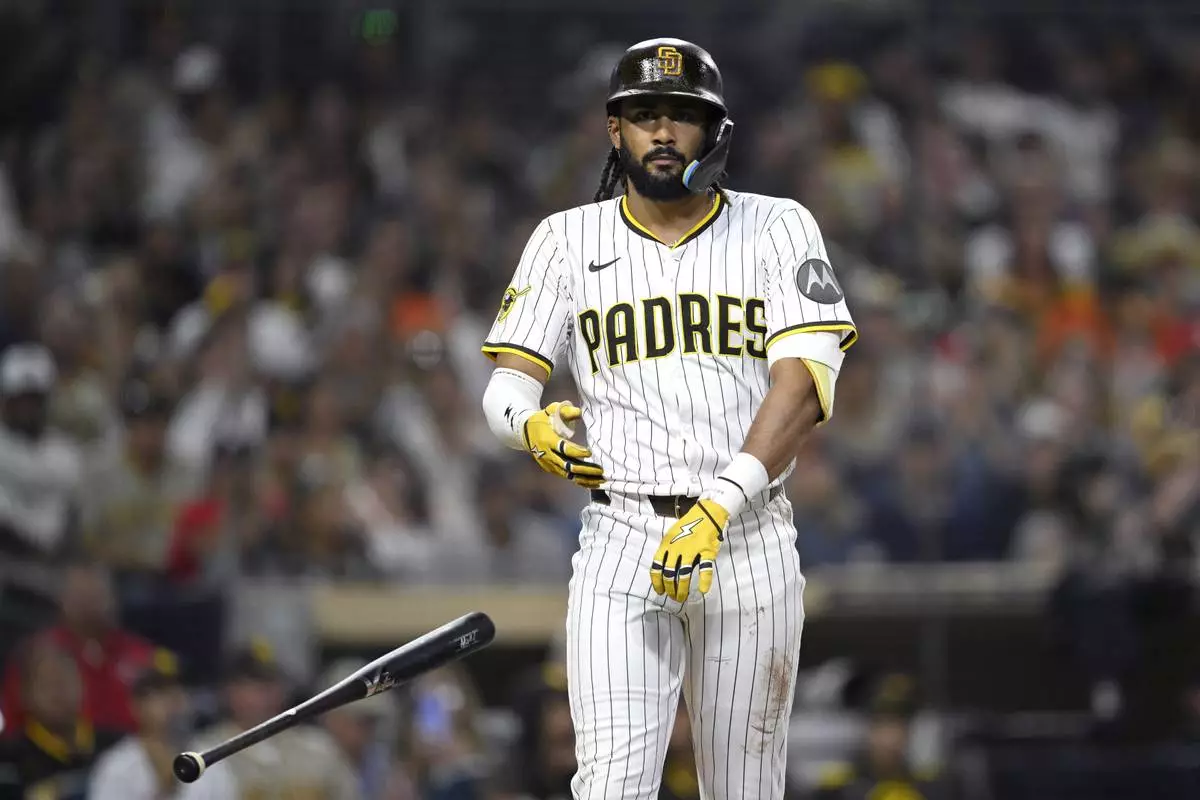San Diego Padres' Fernando Tatis Jr. tosses his bat after a bases-loaded walk during the fourth inning of a baseball game against the San Francisco Giants, Tuesday, Aug. 19, 2025, in San Diego. (AP Photo/Orlando Ramirez)