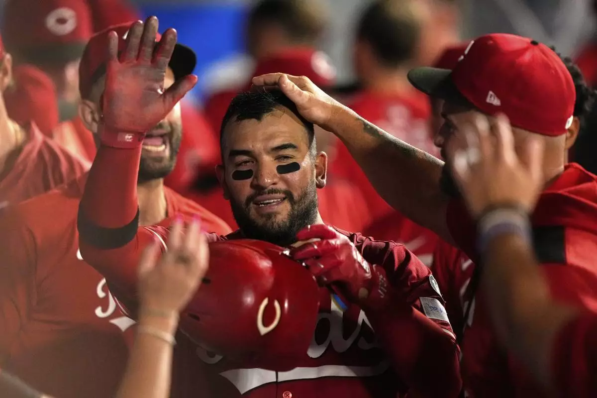 Cincinnati Reds' Jose Trevino is congratulated by teammates in the dugout after scoring on sacrifice by TJ Friedl during the ninth inning of a baseball game against the Los Angeles Angels, Tuesday, Aug. 19, 2025, in Anaheim, Calif. (AP Photo/Mark J. Terrill)