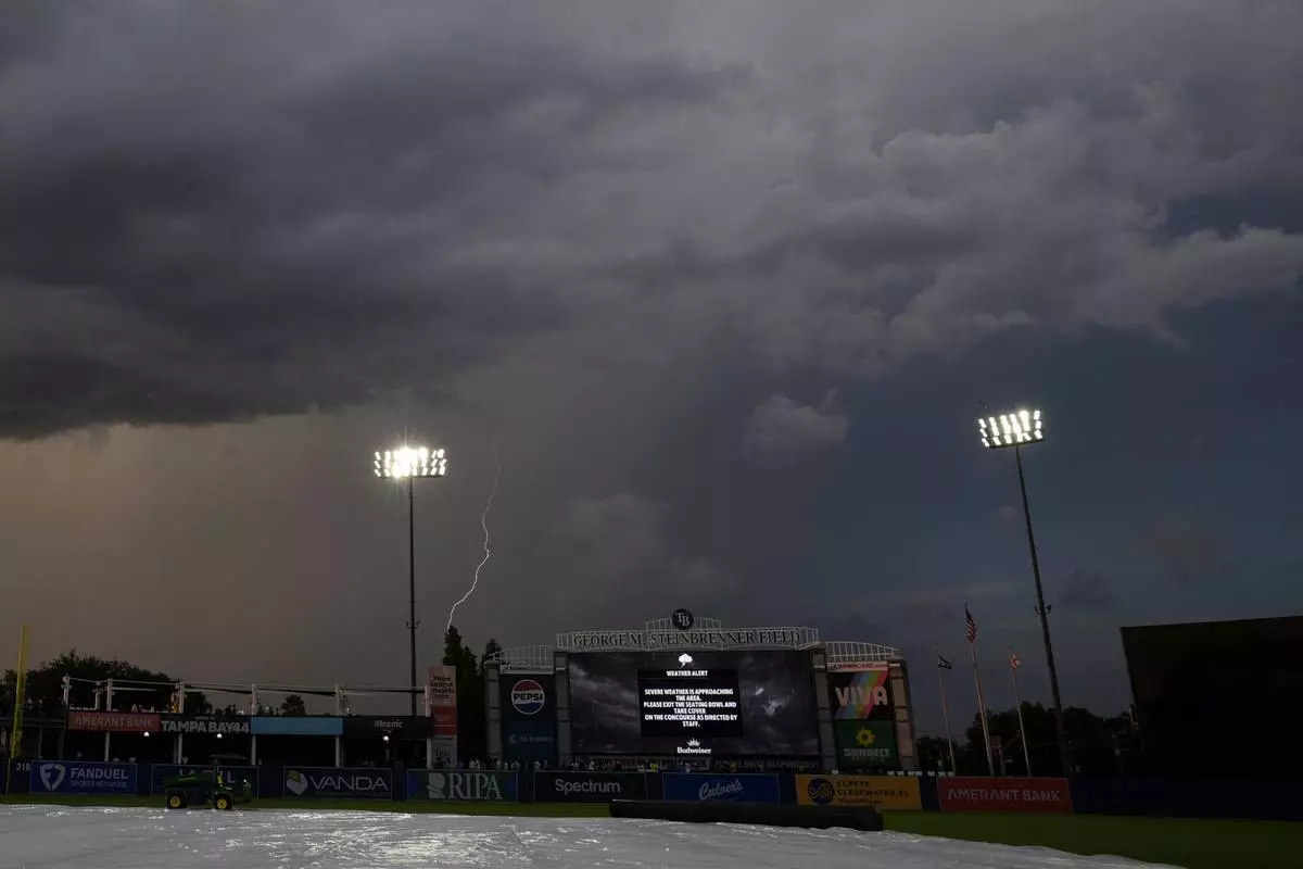 A lightning bolt strikes beyond the outfield wall delaying the start of a baseball game between the Tampa Bay Rays and the New York Yankees Tuesday, Aug. 19, 2025, in Tampa, Fla. (AP Photo/Chris O'Meara)