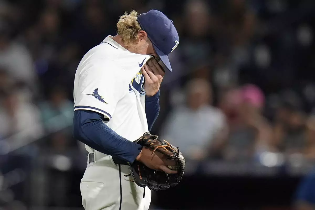 Tampa Bay Rays pitcher Shane Baz reacts after giving up three home runs to the New York Yankees during the first inning of a baseball game Tuesday, Aug. 19, 2025, in Tampa, Fla. (AP Photo/Chris O'Meara)