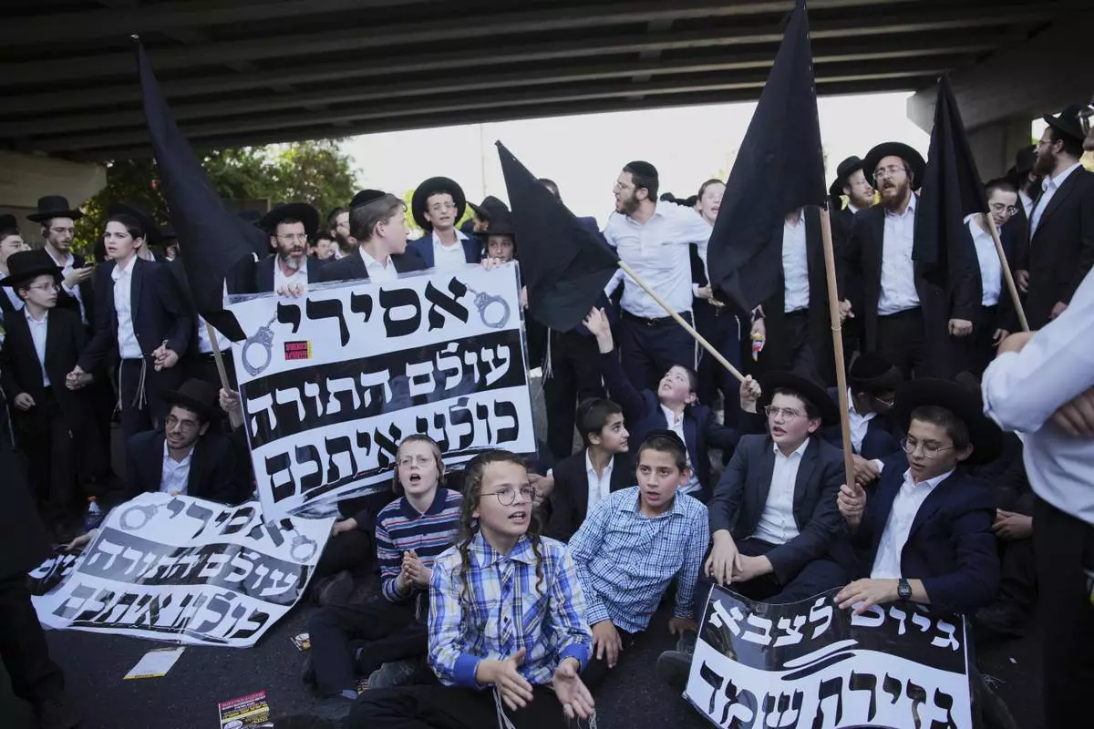 Ultra-Orthodox Jews block a highway during a protest against army recruitment, in Bnei Brak, Israel, Tuesday, Aug. 19, 2025. (AP Photo/Ohad Zwigenberg)