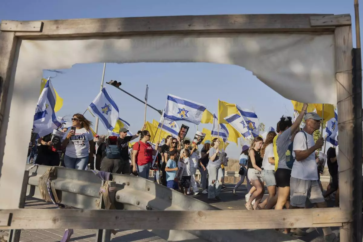 Relatives and supporters of hostages held by Hamas take part in a protest demanding their immediate release and calling for the end of the war in the Gaza Strip as they march on a road near the Israeli-Gaza border, in southern Israel, Wednesday, Aug. 20, 2025. (AP Photo/Maya Levin)