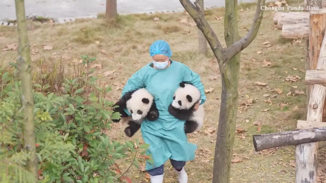 Recently released footage has captured a tender moment between caretaker and panda cubs at the Chengdu Research Base of Giant Panda Breeding in southwest China's Sichuan Province.