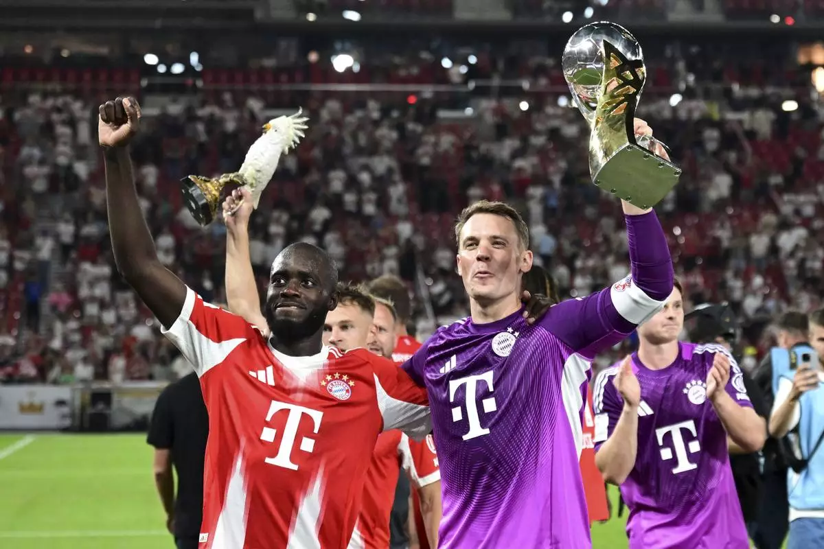 Bayern's Dayot Upamecano, left, and goalkeeper Manuel Neuer celebrate after winning the German Supercup final soccer match between VfB Stuttgart and Bayern Munich in Stuttgart, Germany, Saturday, Aug. 16, 2025. (Bernd Weissbrod/dpa via AP)