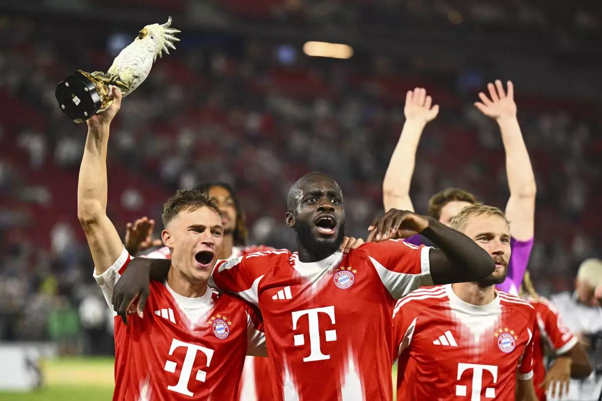 Bayern's, from left, Joshua Kimmich, Dayot Upamecano and Konrad Laimer celebrate after winning the German Supercup final soccer match between VfB Stuttgart and Bayern Munich in Stuttgart, Germany, Saturday, Aug. 16, 2025. (Tom Weller/dpa via AP)