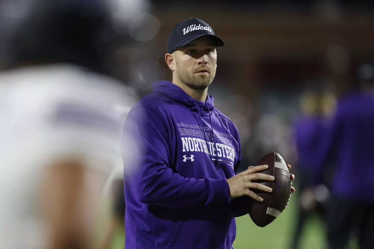 FILE - Northwestern head coach David Braun helps his team warm up before an NCAA football game against Maryland, Oct. 11, 2024, in College Park, Md. (AP Photo/Mike Buscher, File)