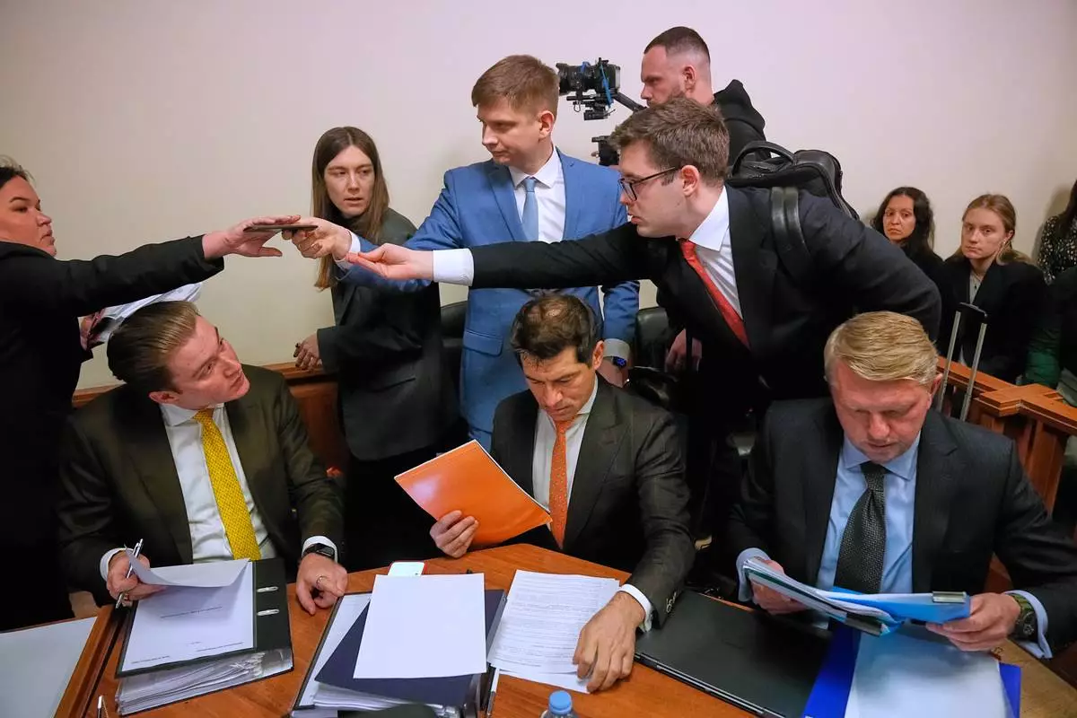 Participants gather in Moscow's Arbitration Court to hold a hearing to consider a lawsuit by Russia's Central Bank against the Euroclear Group in Moscow, Russia, Friday, Jan. 16, 2026. (AP Photo/Pavel Bednyakov)