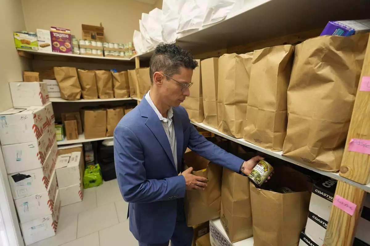Felipe Sousa Lazaballet, executive director of the Hope Community Center looks over inventory for disaster relief needs in the center's food pantry Thursday, Aug. 14, 2025, in Apopka, Fla. (AP Photo/John Raoux)