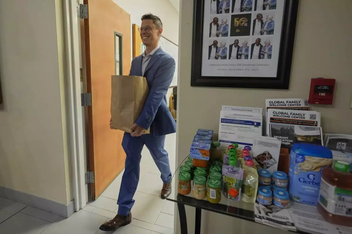 Felipe Sousa Lazaballet, executive director of the Hope Community Center moves items from the food pantry Thursday, Aug. 14, 2025, in Apopka, Fla. (AP Photo/John Raoux)