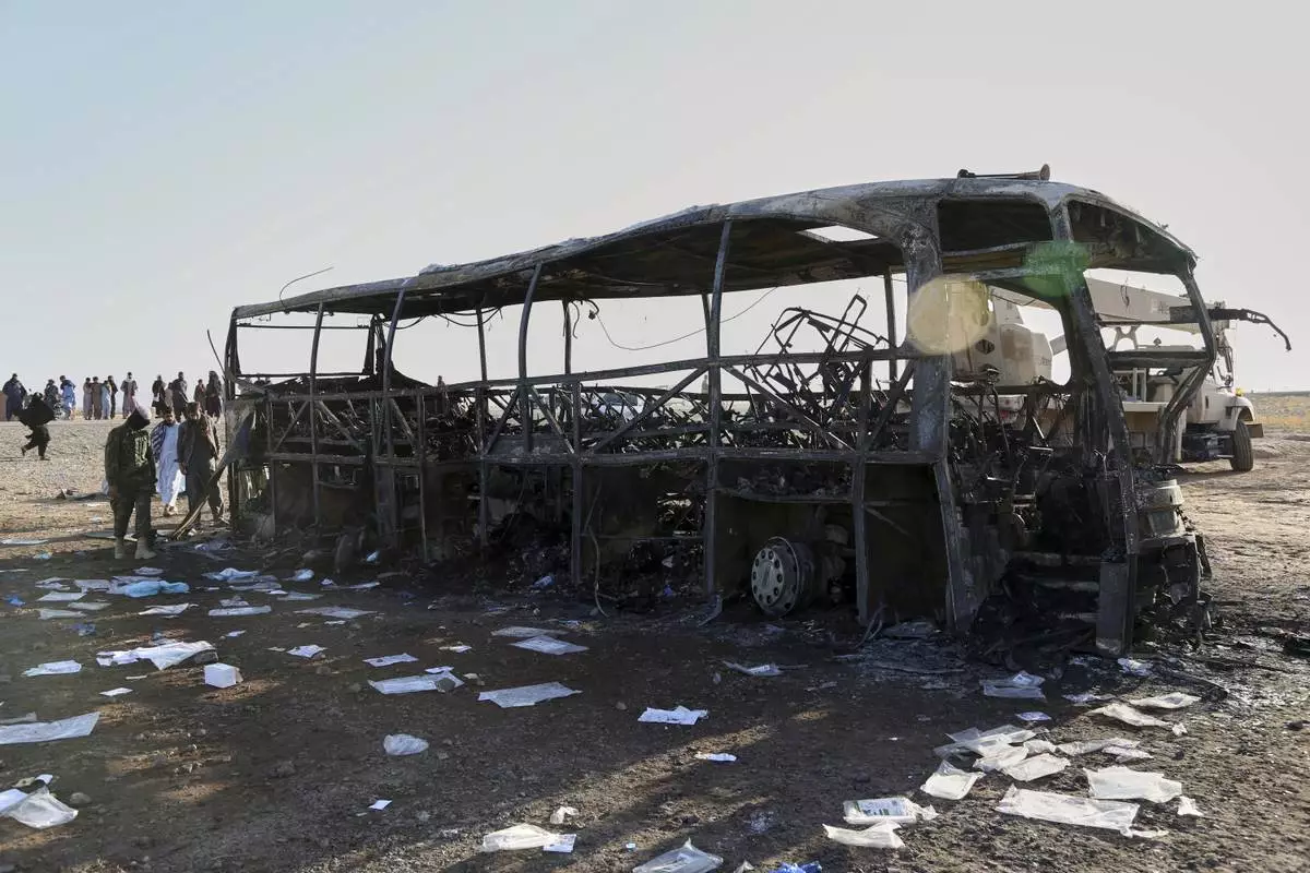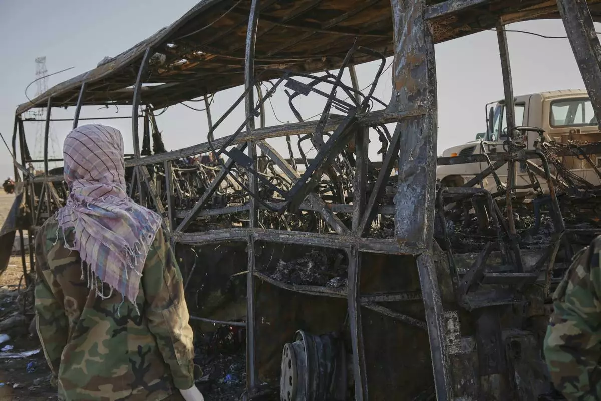 People and soldiers from the Taliban army inspect a burned-out bus that collided with a truck and a motorbike Tuesday evening, causing a massive fire and killing at least 70 people, including children, most of them Afghans returning from Iran, in western Herat province, Afghanistan, Wednesday, Aug. 20, 2025. (AP Photo/Omid Haqjoo)