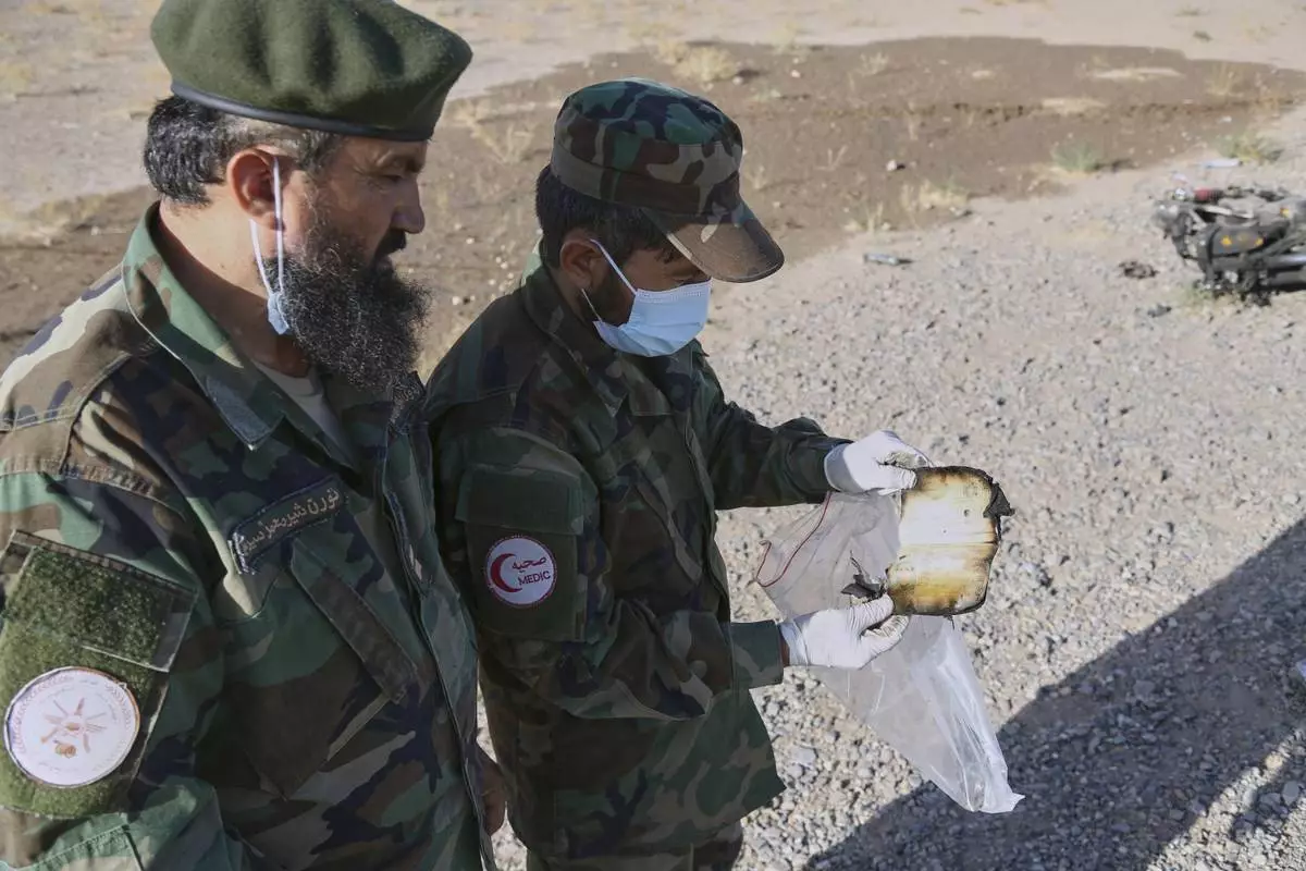 A medic from the Taliban army collects items at the site where a burned-out bus collided with a truck and a motorbike Tuesday evening, causing a massive fire and killing at least 70 people, including children, most of them Afghans returning from Iran, in western Herat province, Afghanistan, Wednesday, Aug. 20, 2025. (AP Photo/Omid Haqjoo)