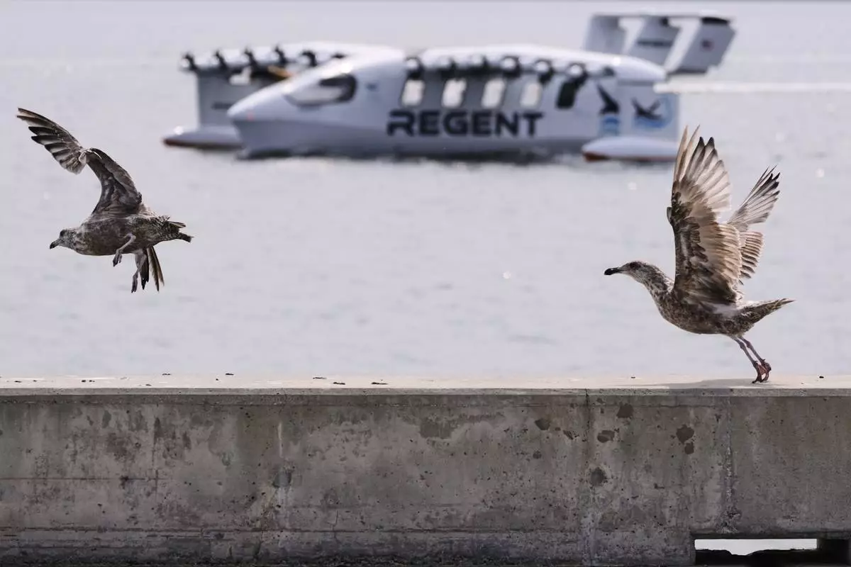 Seagulls take flight as the REGENT Viceroy Seaglider, a winged passenger ferry, returns from a test run on Narragansett Bay, Wednesday, Aug. 6, 2025, off the coast of North Kingstown, R.I. (AP Photo/Charles Krupa)