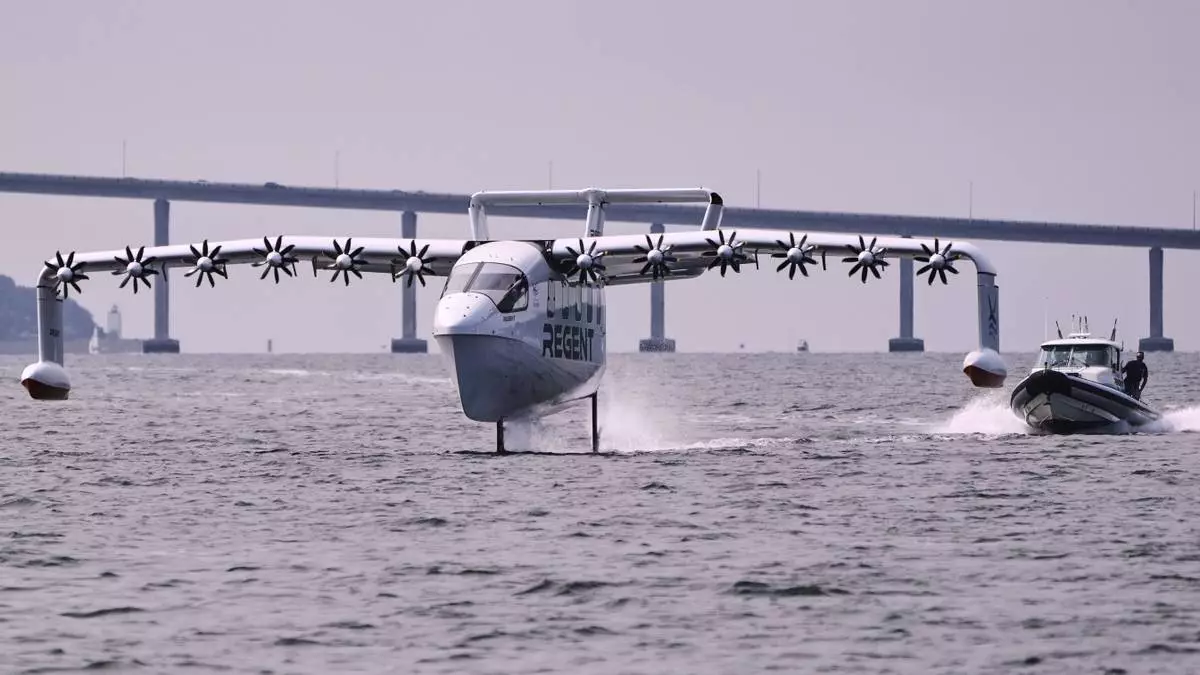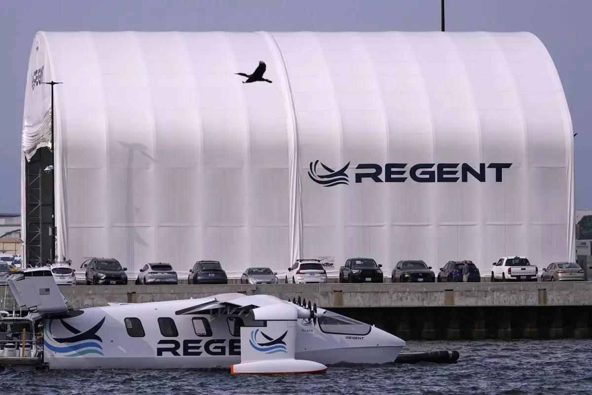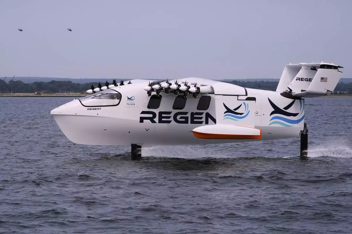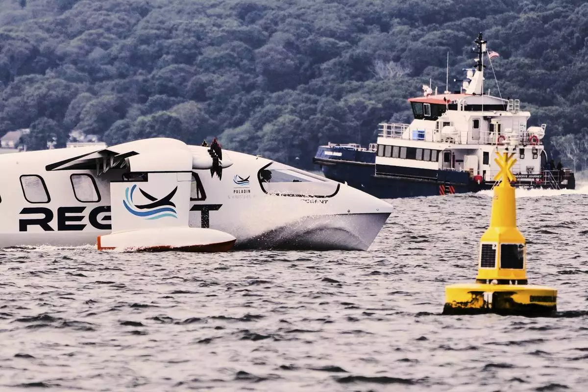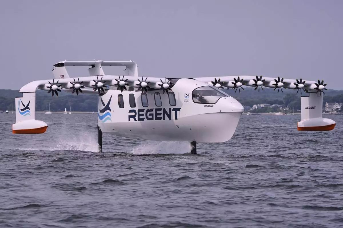 The REGENT Viceroy Seaglider, a winged passenger ferry, glides over the surface of Narragansett Bay on a test run, Wednesday, Aug. 6, 2025, off the coast of North Kingstown, R.I. (AP Photo/Charles Krupa)