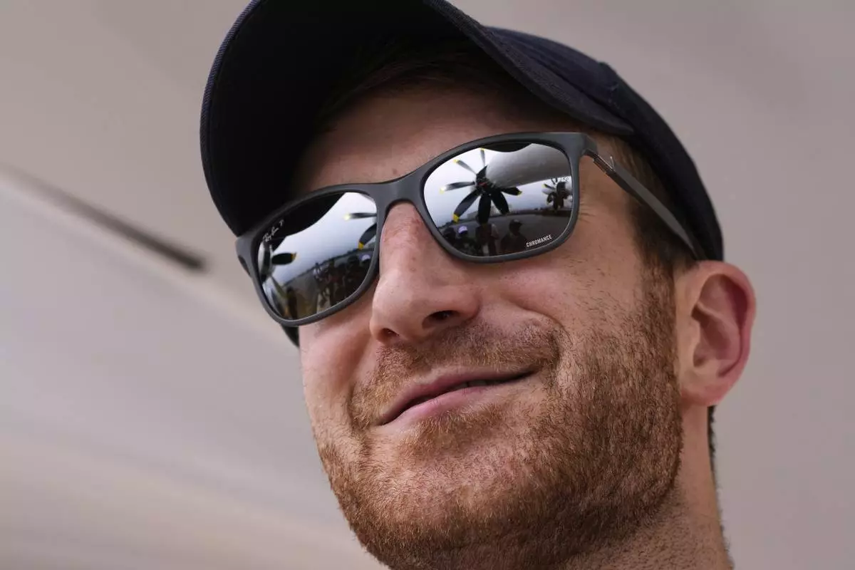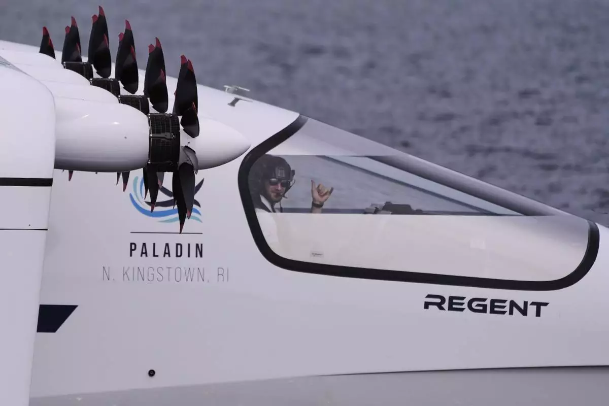 Billy Thalheimer, CEO and Co-Founder of REGENT, gestures after piloting the Viceroy Seaglider, a winged passenger ferry, following a test run on Narragansett Bay, Wednesday, Aug. 6, 2025, off the coast of North Kingstown, R.I. (AP Photo/Charles Krupa)