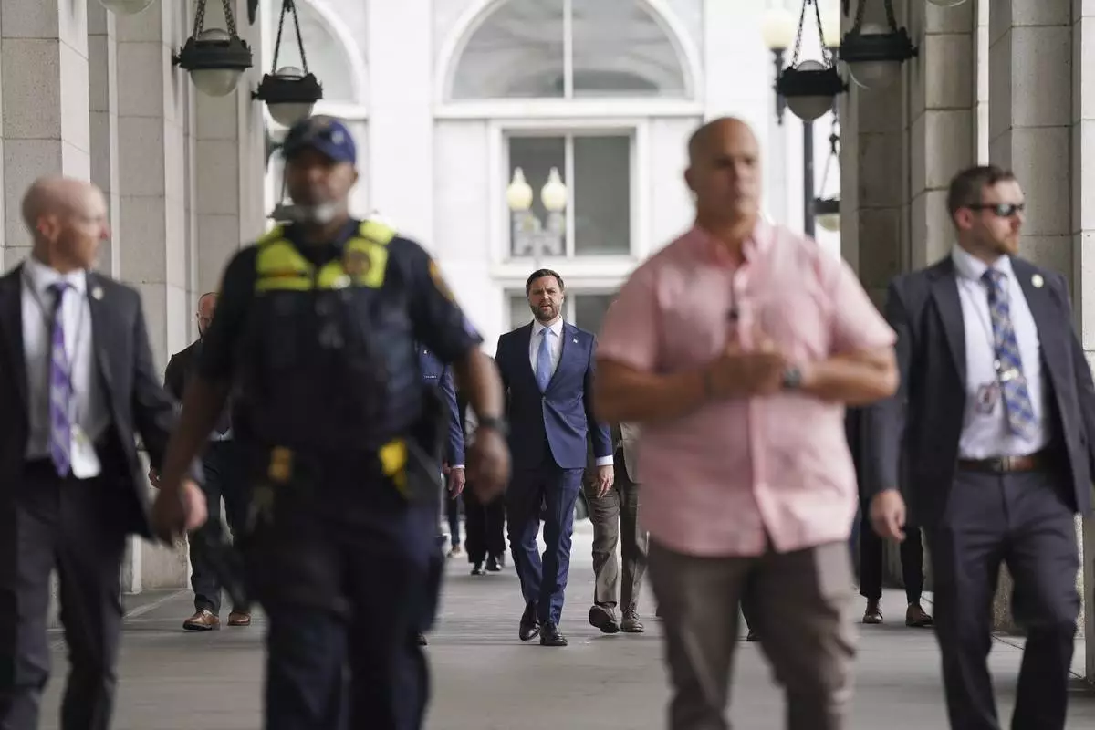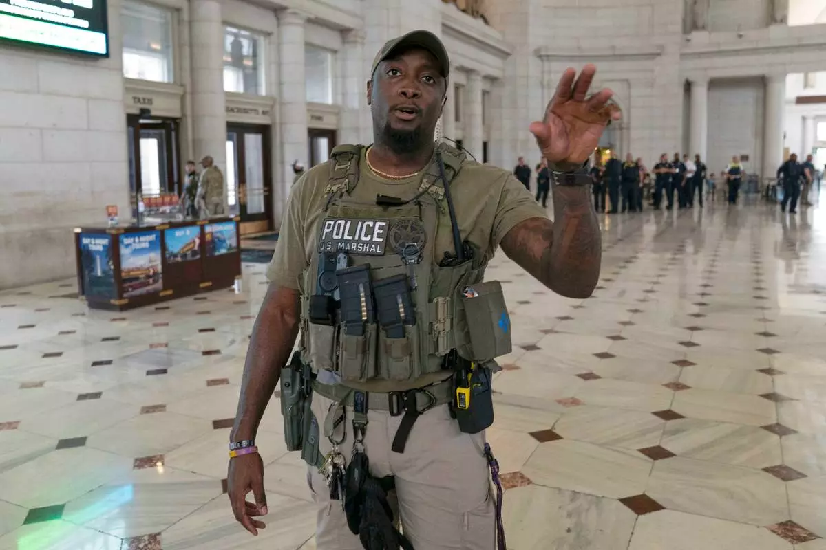 A U.S Marshal instructs media to stay back as Vice President JD Vance, Defense Secretary Pete Hegseth and White House Deputy Chief of Staff Stephen Miller visit with members of the National Guard at Union Station, in Washington Wednesday. Aug. 20, 2025. (AP Photo/Jose Luis Magana)