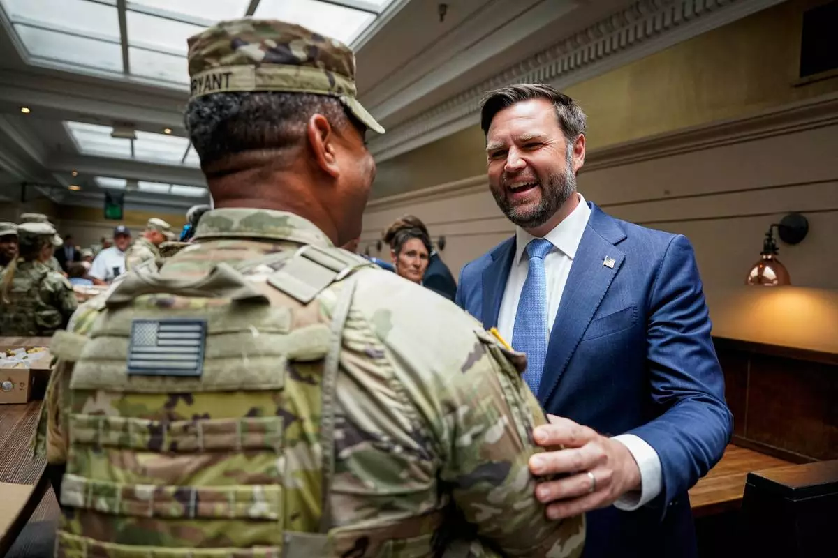 Vice President JD Vance greets a member of the National Guard at Union Station in Washington, Wednesday, Aug. 20, 2025. (Alexander Drago/Pool via AP)