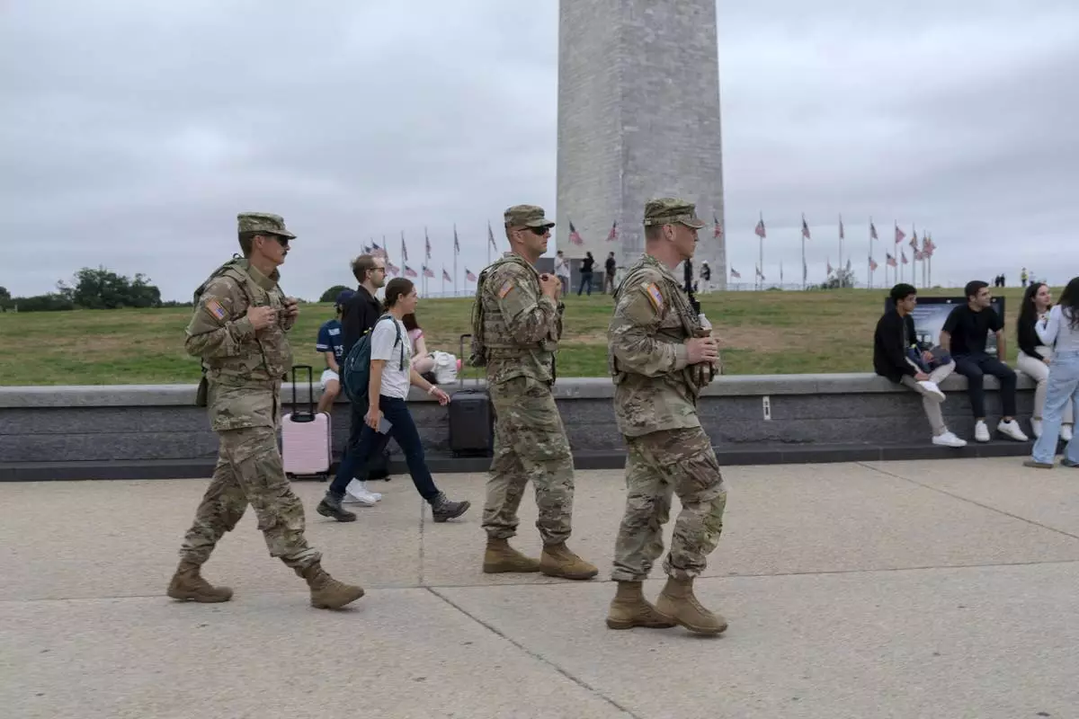 Members of the District of Columbia National Guard patrol near the Washington Monument on the National Mall, Tuesday, Aug. 19, 2025, in Washington. (AP Photo/Jose Luis Magana)