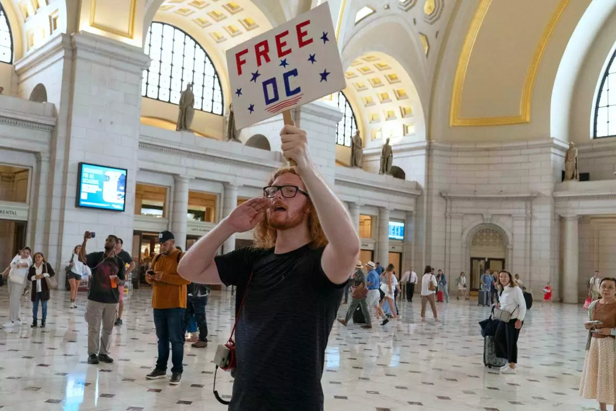 Nadine Seiler of Waldorf, Md., displays her banner as protesters, police, and National Guard troops congregate at the entrance to Union Station in Washington, Wednesday, Aug. 20, 2025. (AP Photo/J. Scott Applewhite)