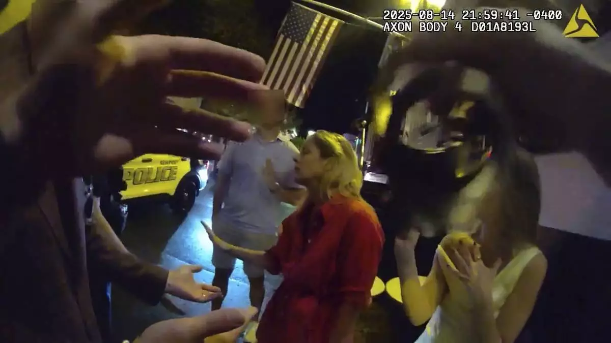 In an image taken from police body camera footage, Newport Police officers interacting with Rhode Island Special Assistant Attorney General Devon Flanagan, in red, and her companions after restaurant representatives indicated that they did not want them on their premises, an encounter that ended with officers detaining Flanagan on trespassing charges, Aug. 14, 2025, in Newport, R.I. (Newport Police Department via AP)