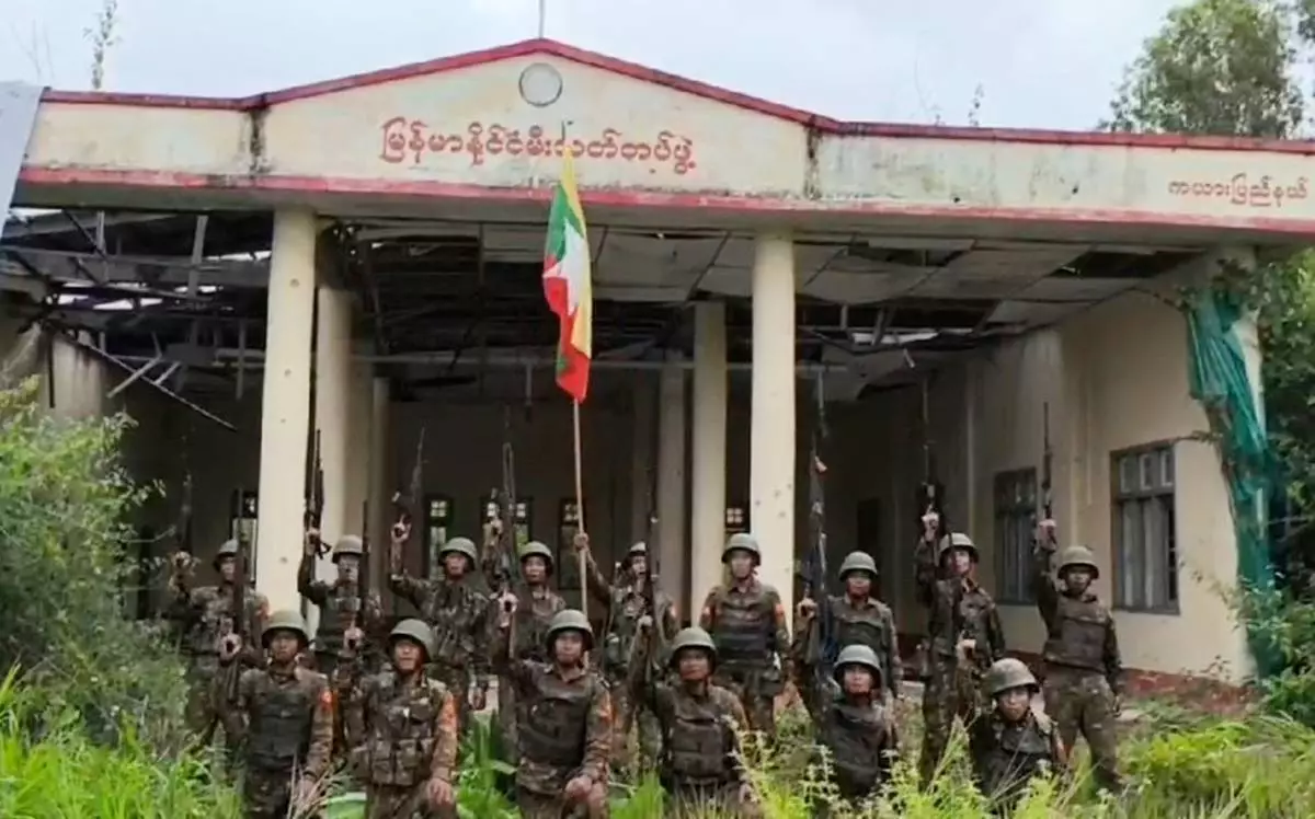 Army soldiers pose in front of the captured fire department station in Myanmar's eastern state of Kayah, which the military government claim to have recaptured from resistance forces, on Tuesday, Aug. 19, 2025 (Myanmar Military via AP)