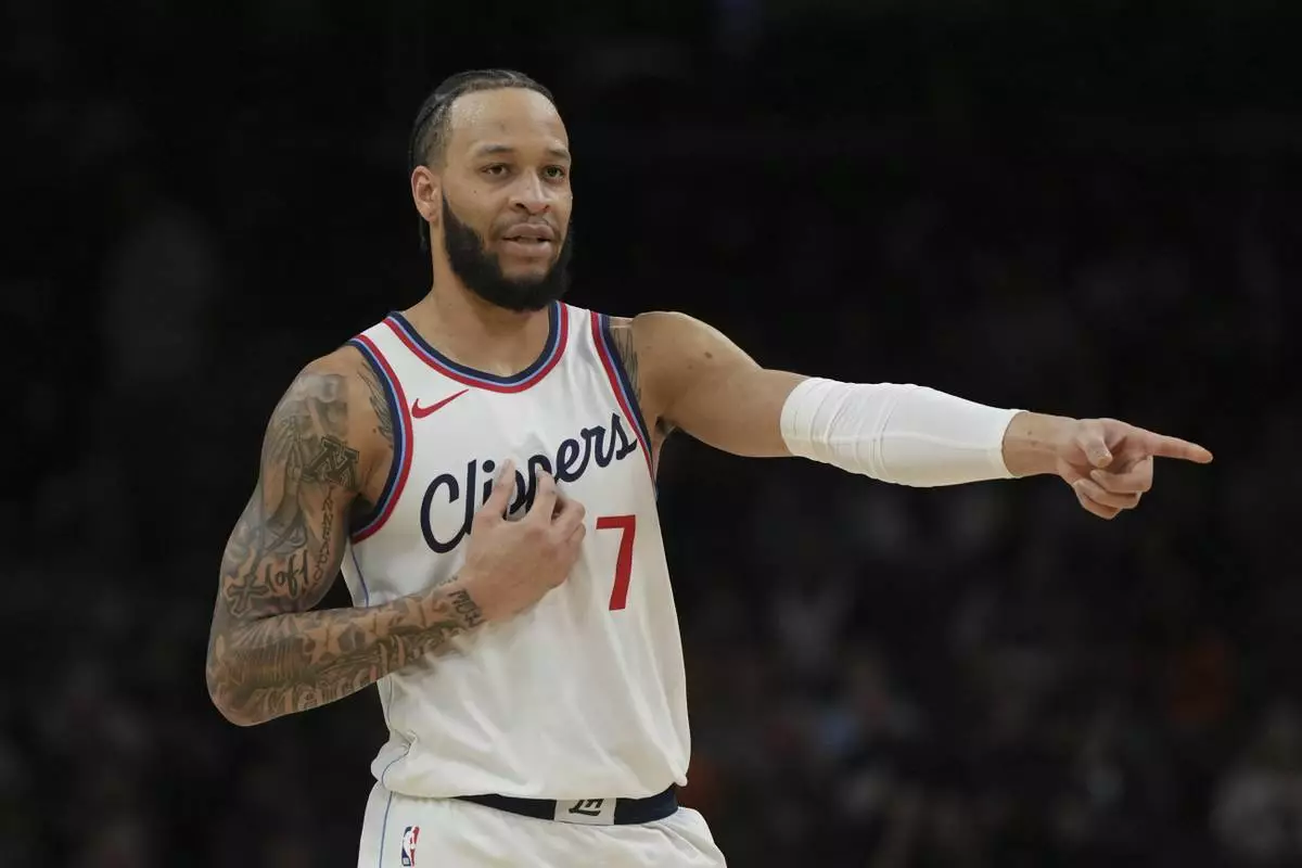 FILE - LA Clippers guard Amir Coffey points during the first half of an NBA basketball game against the Phoenix Suns, Tuesday, March 4, 2025, in Phoenix. (AP Photo/Rick Scuteri, File)