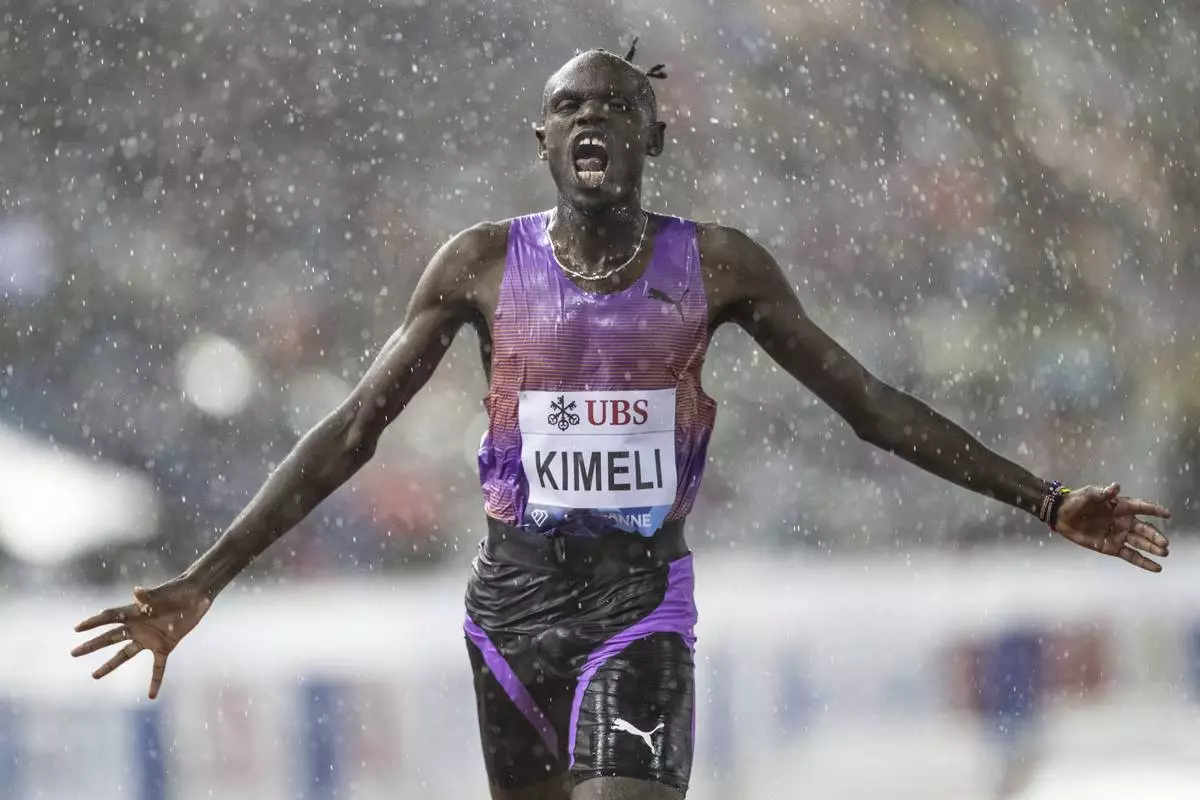 Isaac Kimeli,of Belgium, reacts as he crosses the finish line to win the men's 5,000-meter event at the Wanda Diamond League 'Athletissima Lausanne' athletics meeting in Lausanne, Switzerland, Wednesday, Aug. 20, 2025. (Laurent Gillieron/Keystone via AP)