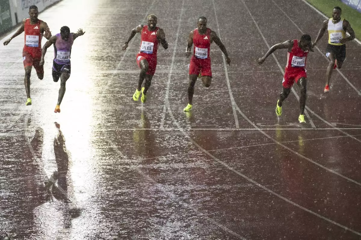 LAUSANNE, Switzerland (AP) — Olympic 100-meter champion Noah Lyles was beaten again by Oblique Seville when the Jamaican splashed to victory Wednesday at a rain-soaked Athletissima meet.