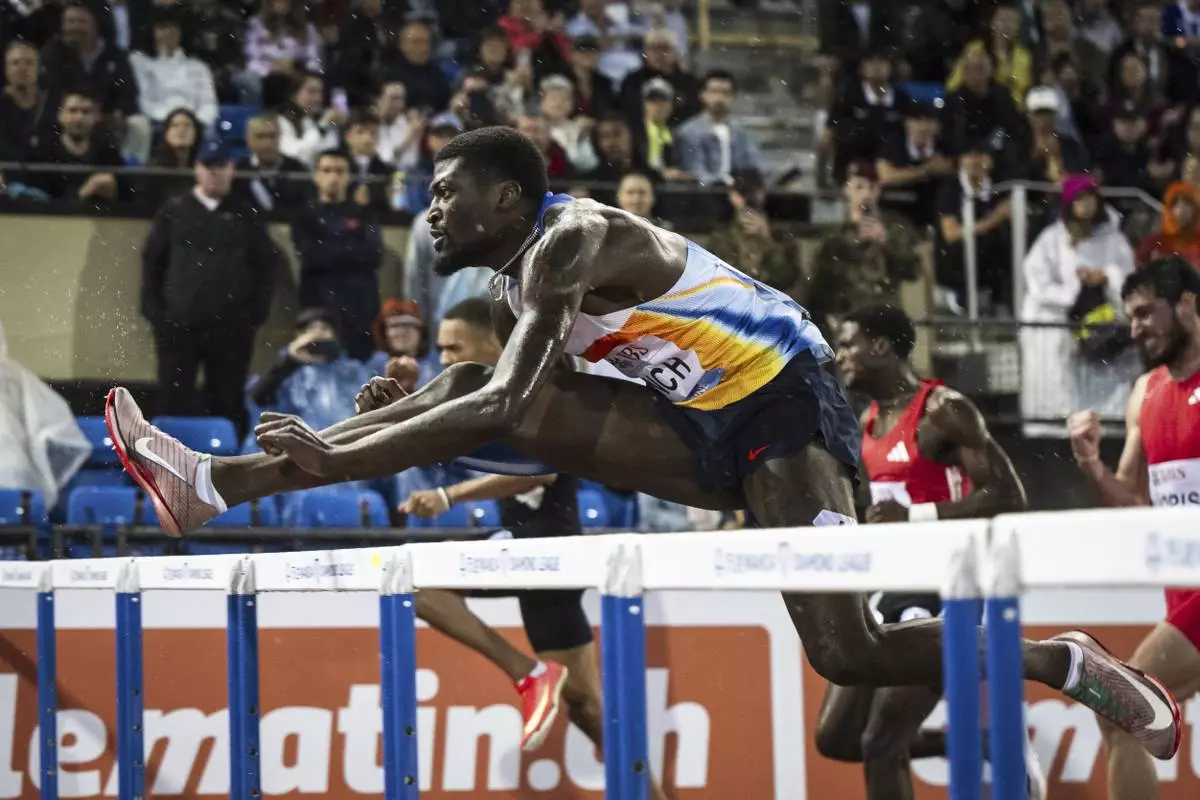 Cordell Tinch of United States runs to win the men's 110m hurdles race at the Wanda Diamond League 'Athletissima Lausanne' athletics meeting in Lausanne, Switzerland, Wednesday, Aug. 20, 2025. (Jean-Christophe Bott/Keystone via AP)
