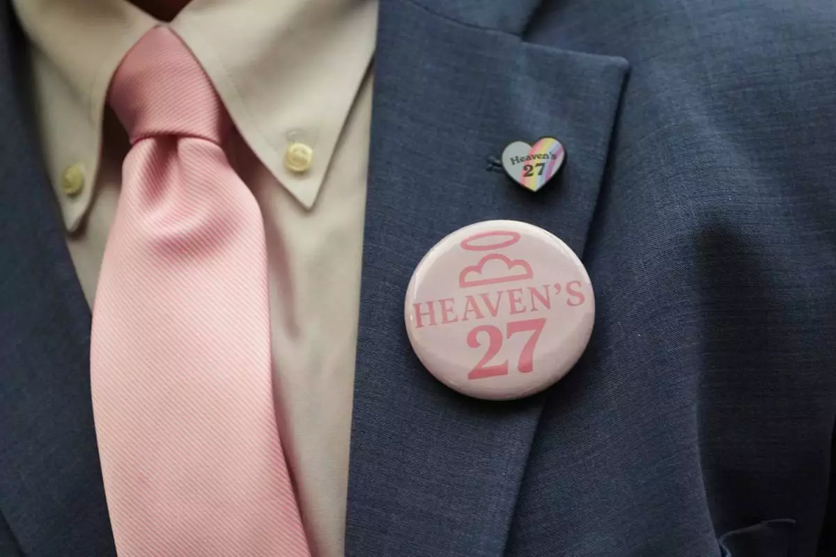 The parent of a child lost to the recent flooding in Kerr County wears a 'Heaven's 27' button during a Texas Senate hearing at the Texas Capitol, Wednesday, Aug. 20, 2025, in Austin, Texas. (AP Photo/Eric Gay)