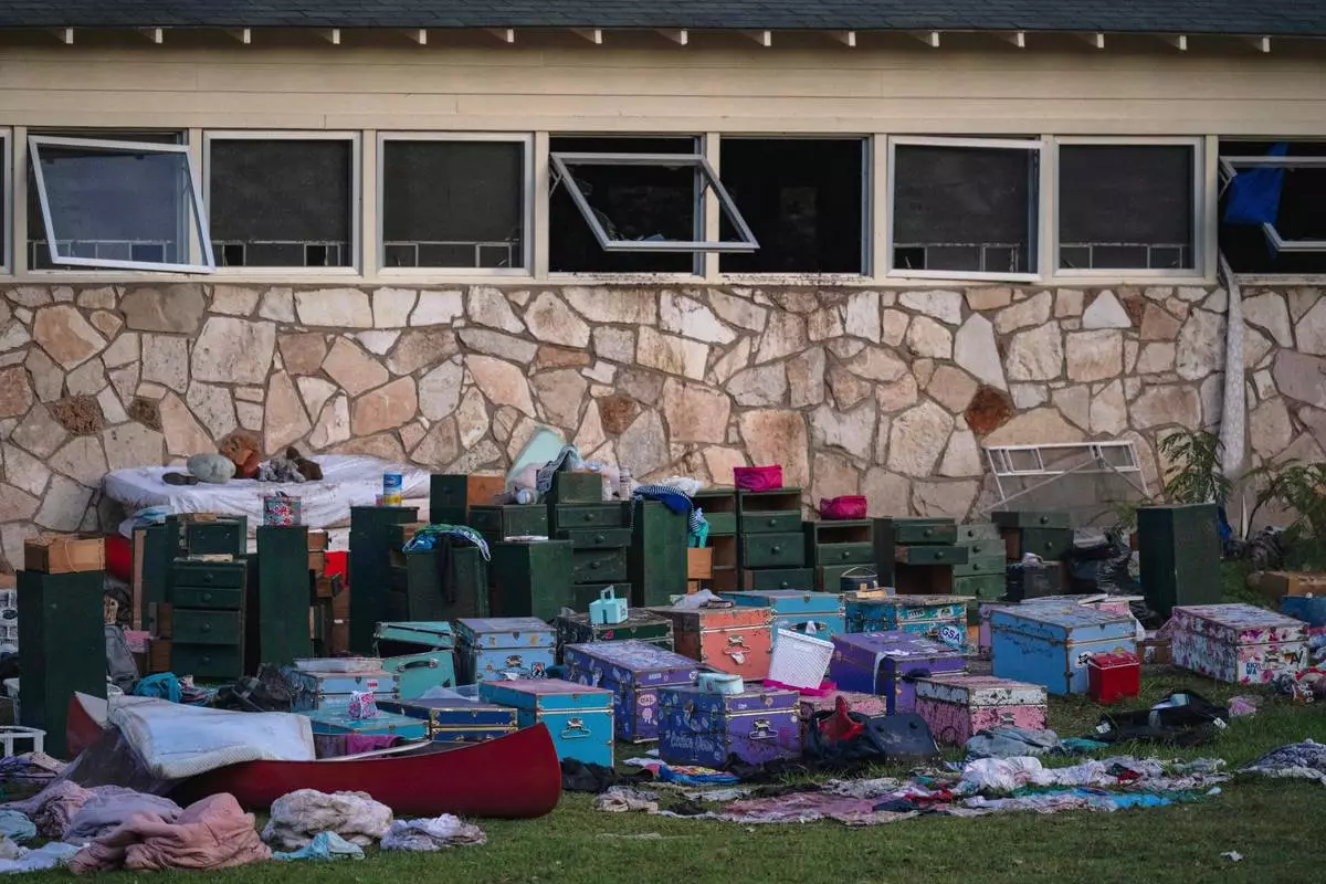 FILE - The belongings of campers sit outside one of Camp Mystic's cabins near the Guadalupe River in Hunt, Texas, on July 7, 2025, after a deadly flash flood swept through the area. (AP Photo/Eli Hartman, File)