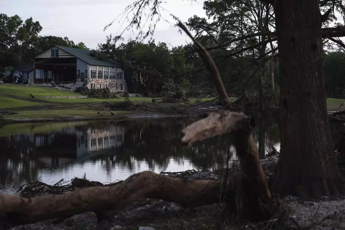 FILE - A building at Camp Mystic is reflected in water after a flash flood swept through the area, on July 7, 2025, in Hunt, Texas. (AP Photo/Eli Hartman, File)
