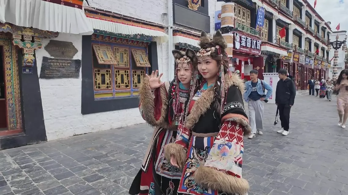 "Each region of Xizang has its own distinctive traditional dress, like the Khampa dress in Chamdo, the Kongpo dress in Nyingchi, and the Bola dress in Lhasa. The Khampa dress is a dress with sloping shoulders, which originates from Chamdo's unique climate, where temperature differences between day and night are significant. Local pastoralists often tie one sleeve around their waist while working and put on both sleeves when it gets cold. In everyday life, the Khampa dress is generally worn in only one color. But for weddings or festivals, we would wear dresses with motifs that symbolize good wishes," explained Zhaxiwengzong, an employee at a traditional Tibetan clothing photography studio.