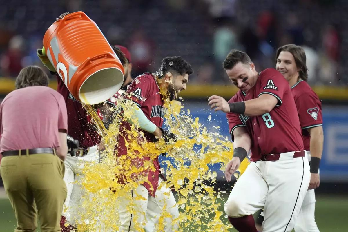 Arizona Diamondbacks' Adrian Del Castillo, left, gets hit with Gatorade as he celebrates his walk-off single against the Cleveland Guardians with Diamondbacks' James McCann (8) after a baseball game Wednesday, Aug. 20, 2025, in Phoenix. (AP Photo/Ross D. Franklin)
